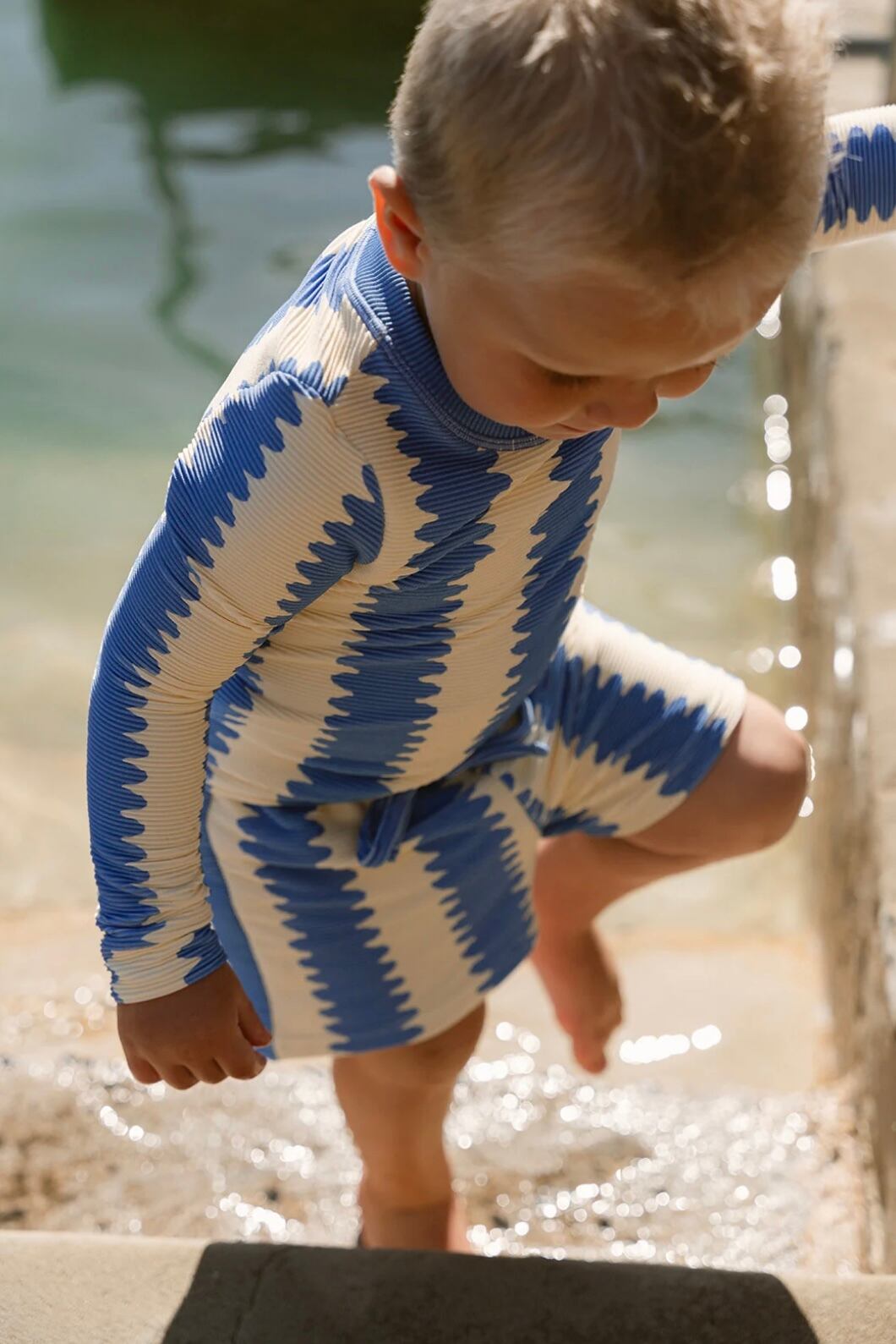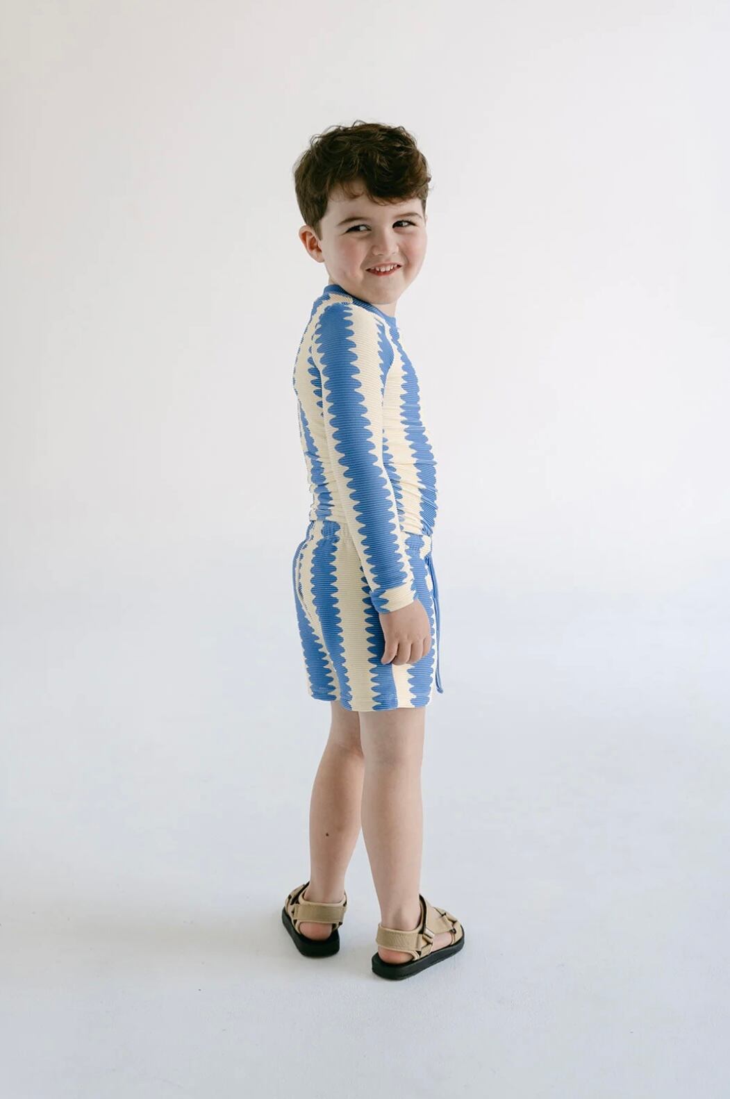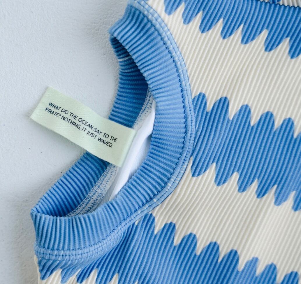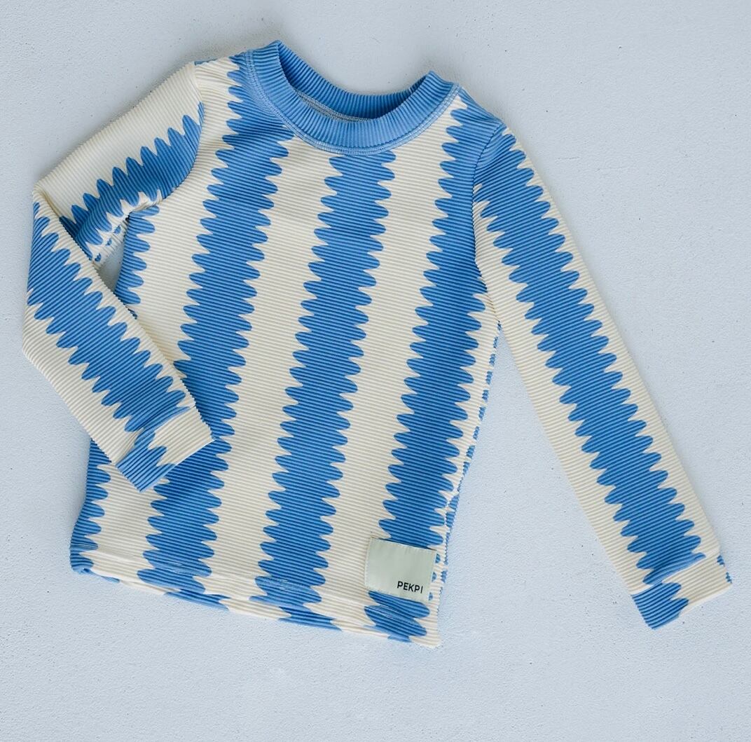 オーガニックコットンリブ素材を使用したロングスリーブトップ。ユニークなブルーの波形ストライプが目を引く一枚。柔らかく伸縮性のある生地で、お子さまの動きを妨げず快適に着用いただけます。
