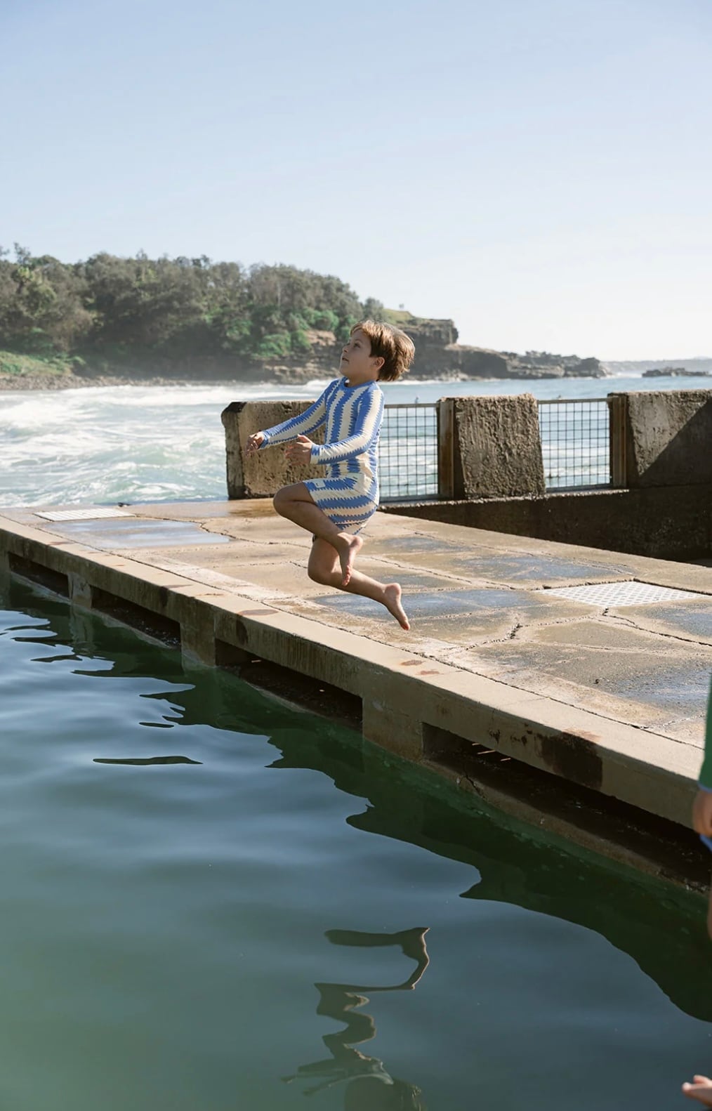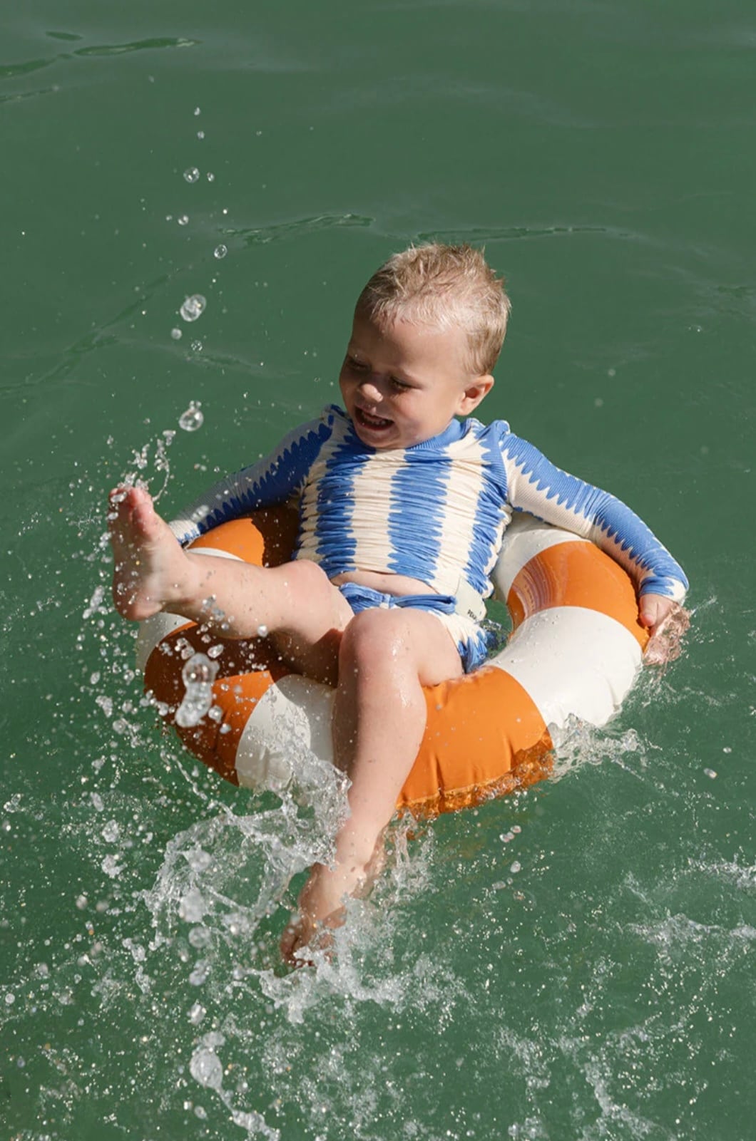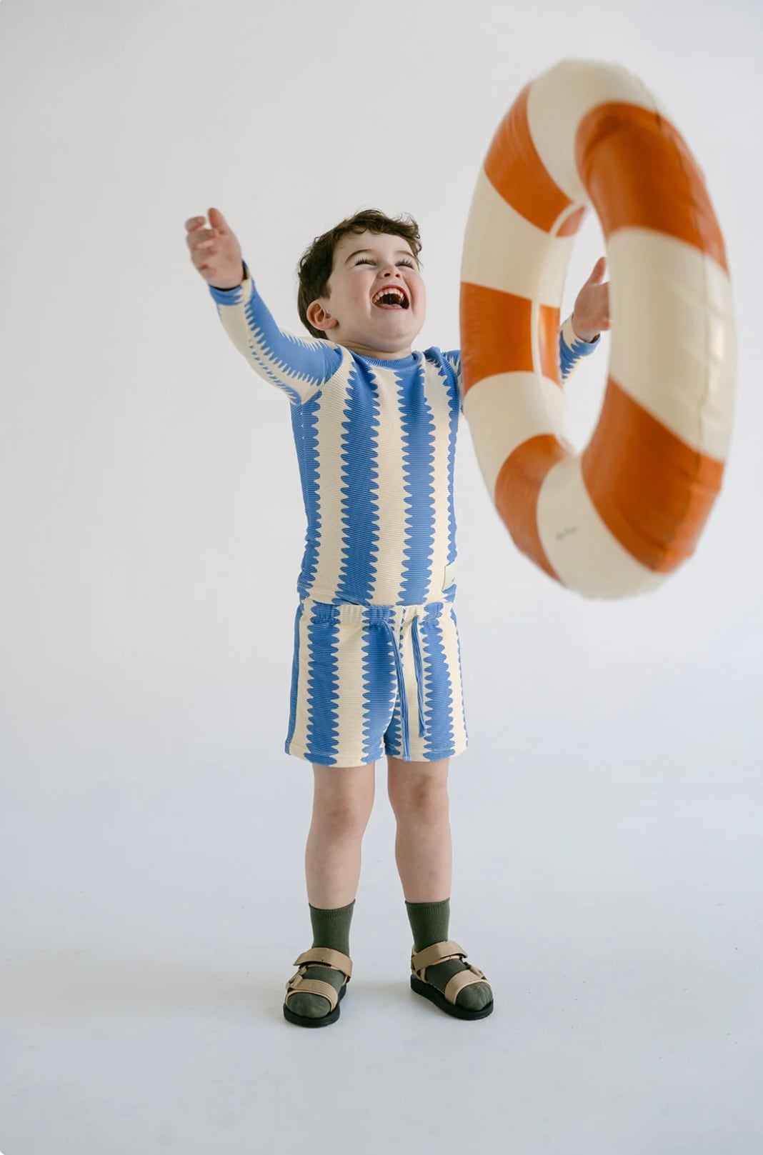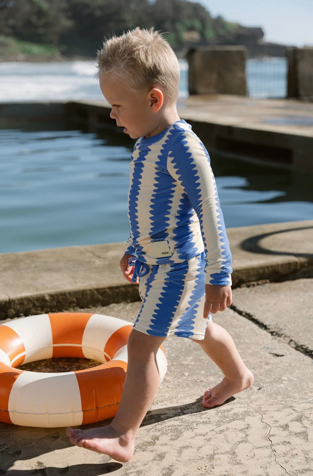 オーガニックコットンリブ素材を使用したロングスリーブトップ。ユニークなブルーの波形ストライプが目を引く一枚。柔らかく伸縮性のある生地で、お子さまの動きを妨げず快適に着用いただけます。
