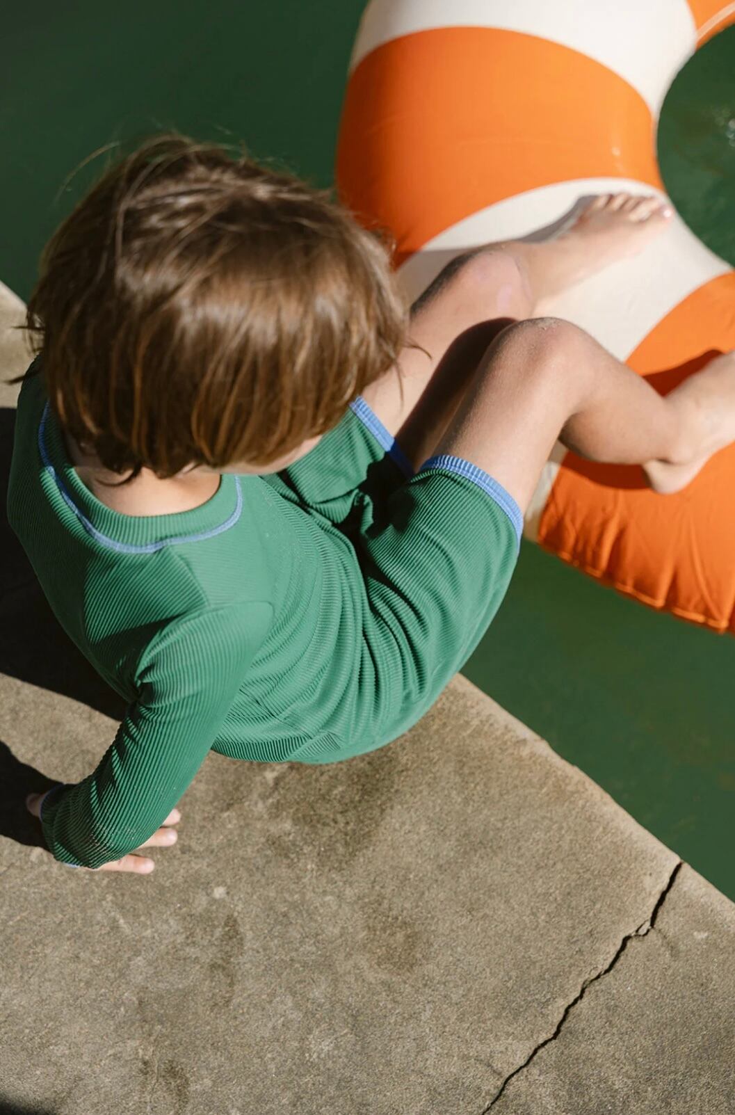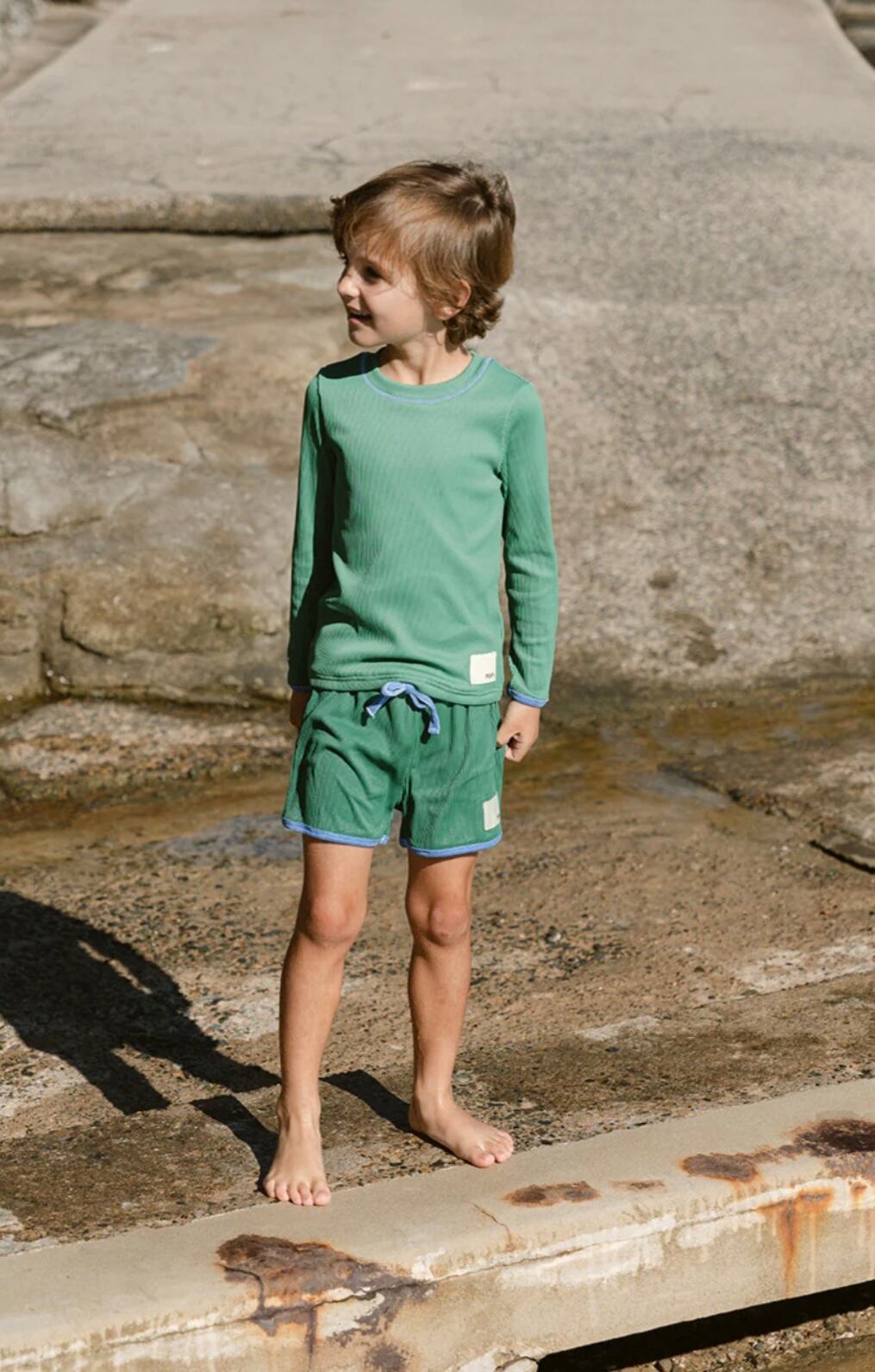 ナチュラルカラーのストライプが印象的な、長袖ラッシュガードトップ。サステナブルなリサイクル素材で作られ、快適さと環境へのやさしさを両立。首元のジッパー付きで着脱も簡単。