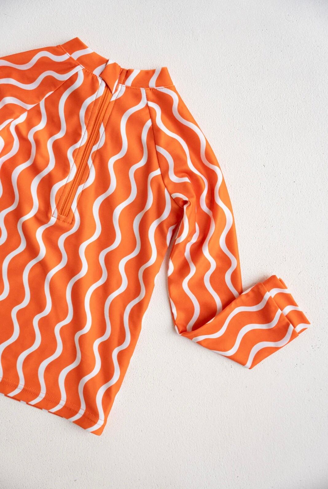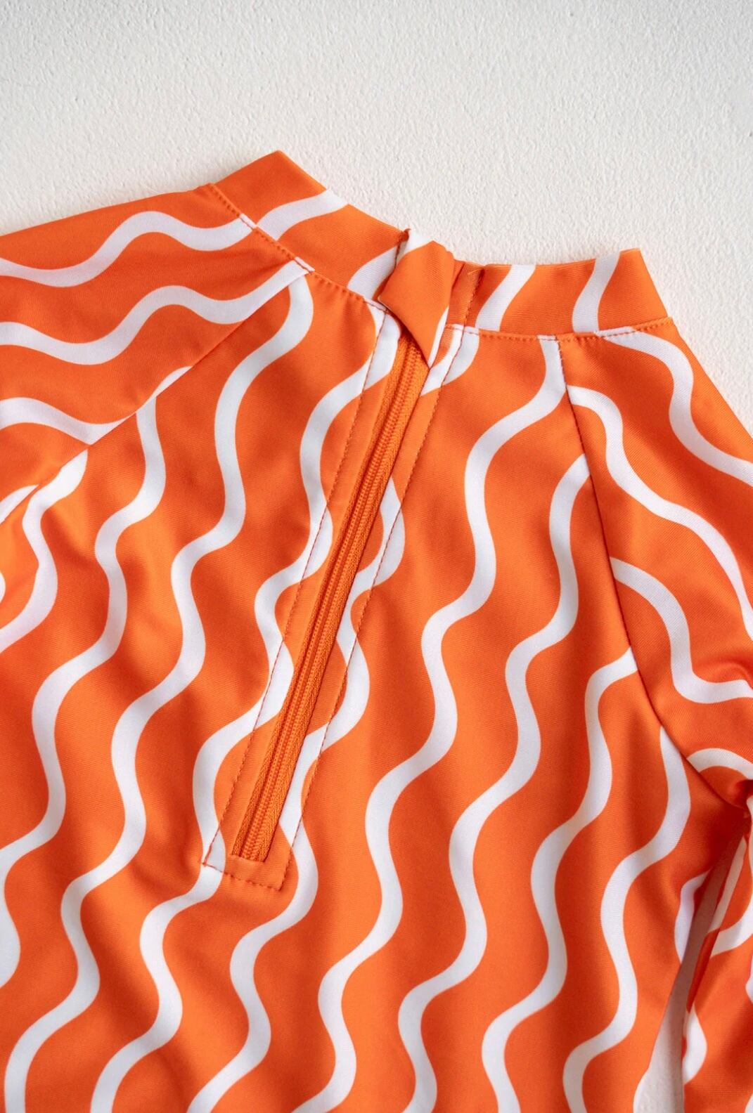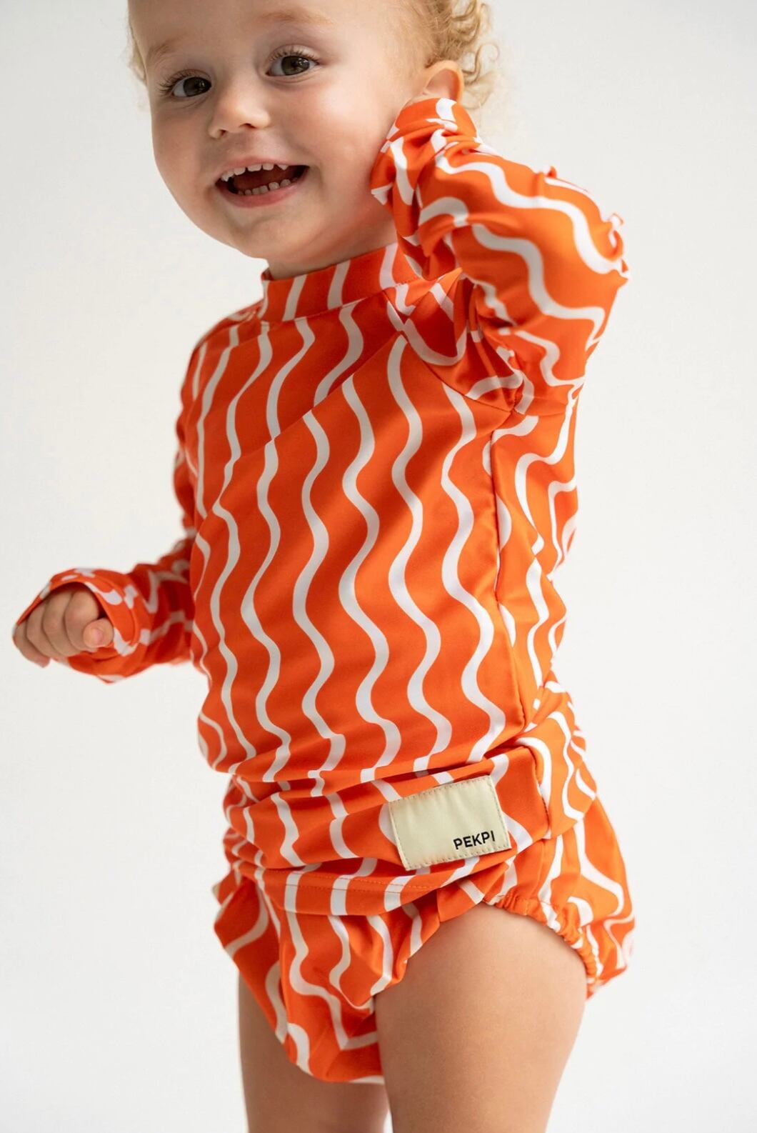 PEKPIのラッシュガードスイムトップは、元気いっぱいなサマープリントが目を引く、長袖タイプのスイムウェアです。