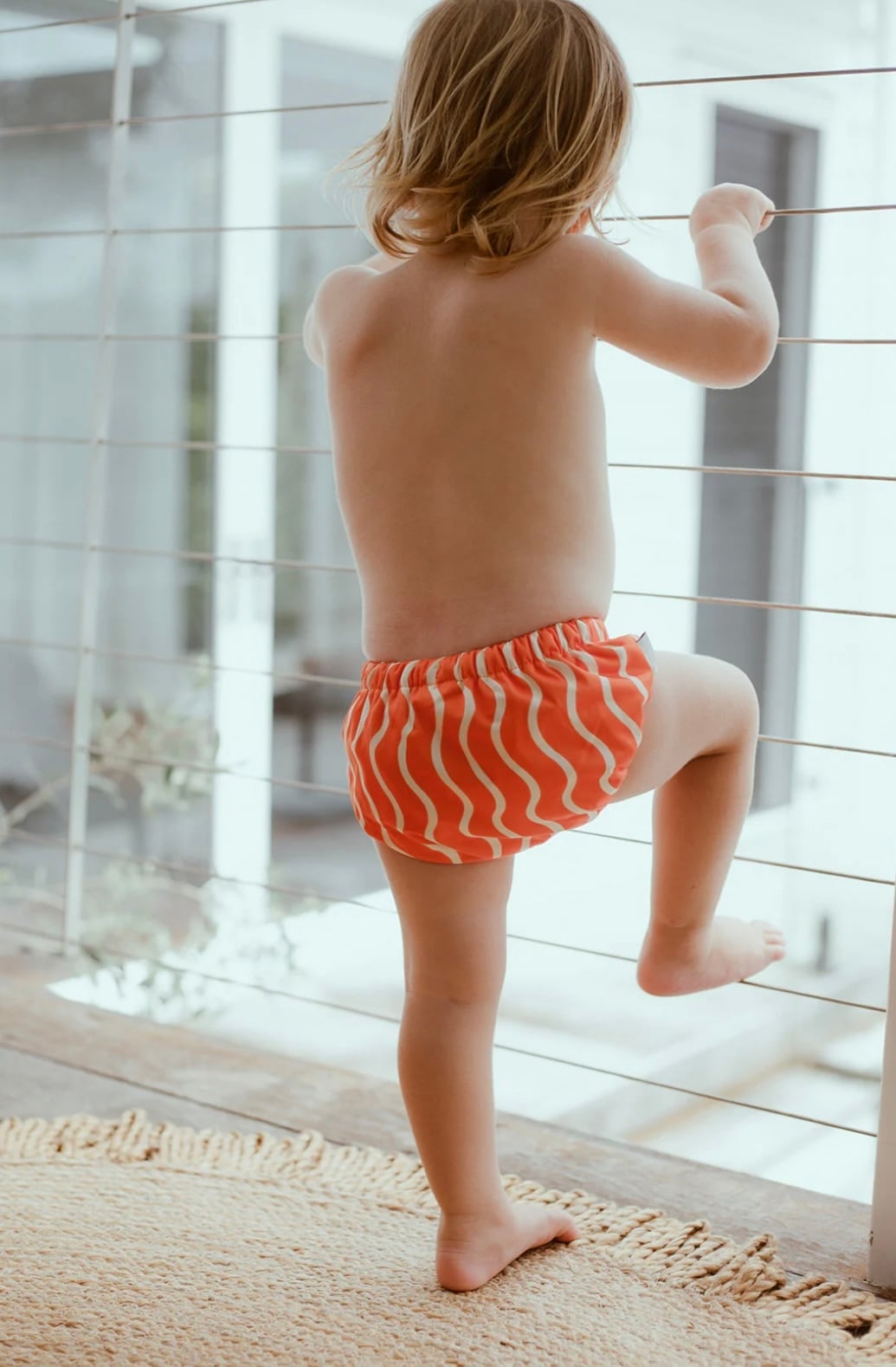 REPREVE® Our Ocean™ 素材を使用した、環境にやさしいリユーザブル(再利用可能)なおむつ型スイムウェアです。