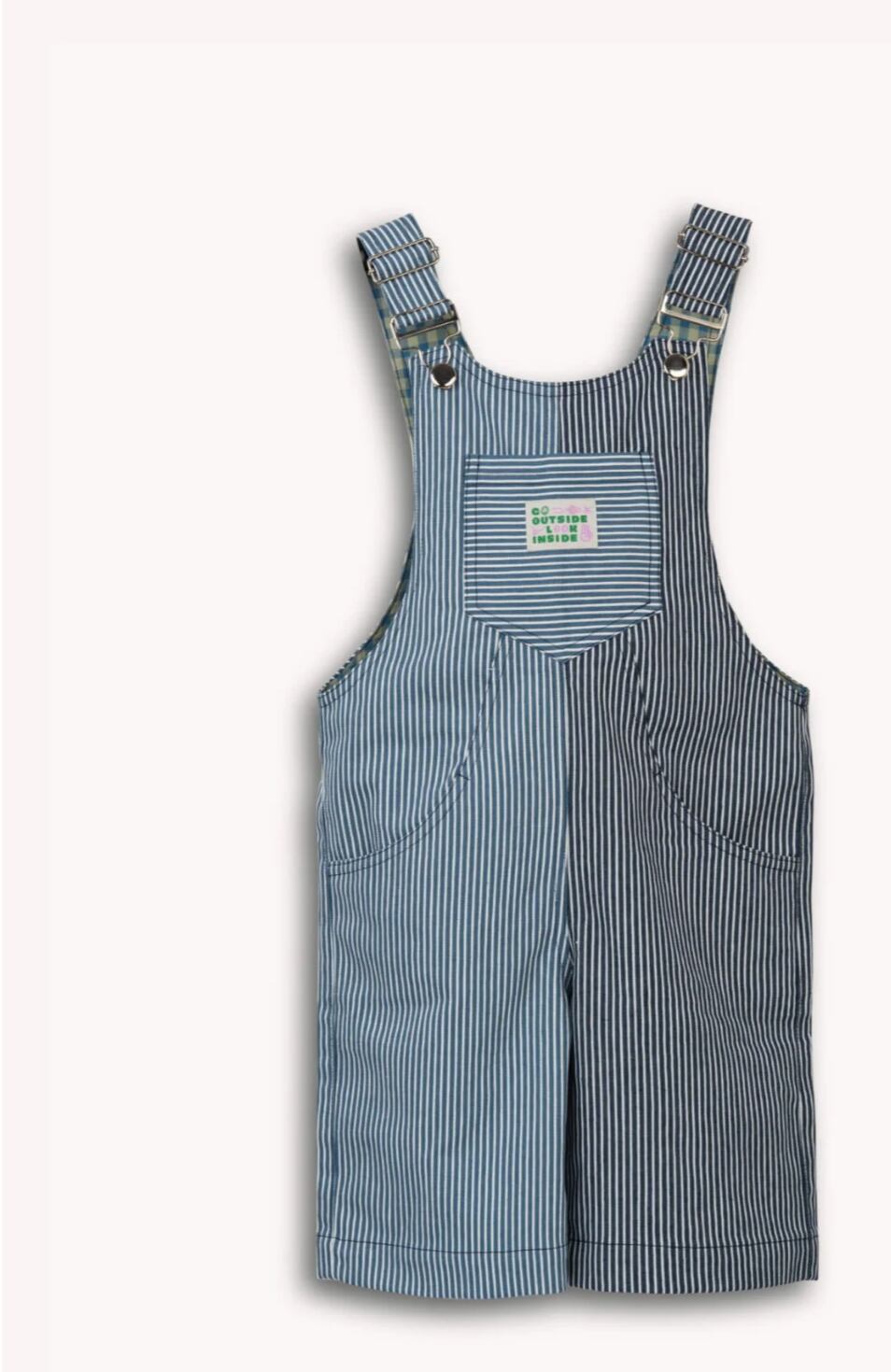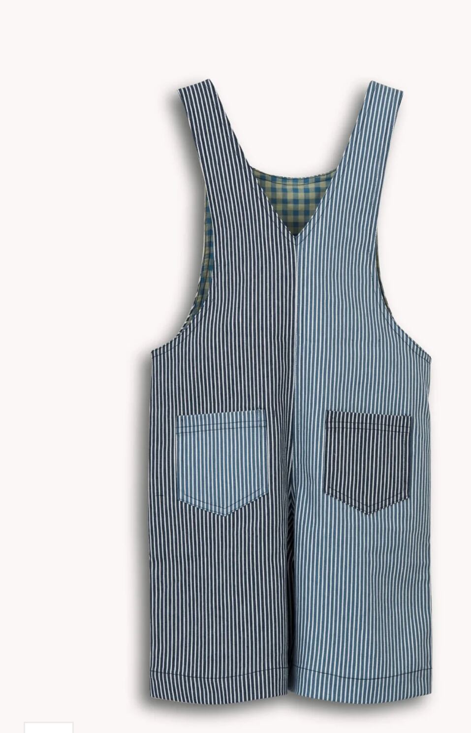 調整可能なストラップとフロントボタン留めが特徴のショート丈ダンガリー。ひざ下までの長さで、ゆったりとしたフィット感と股下のゆとりが動きやすさを実現。前面にはパッチポケット付きで、異素材のコントラストデザインがポイントです。