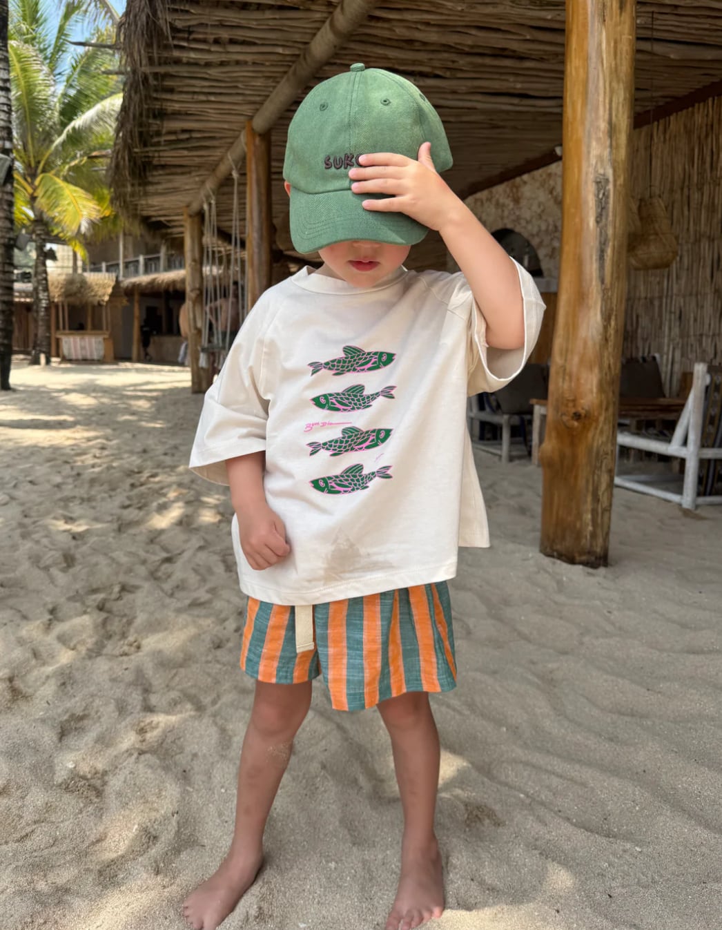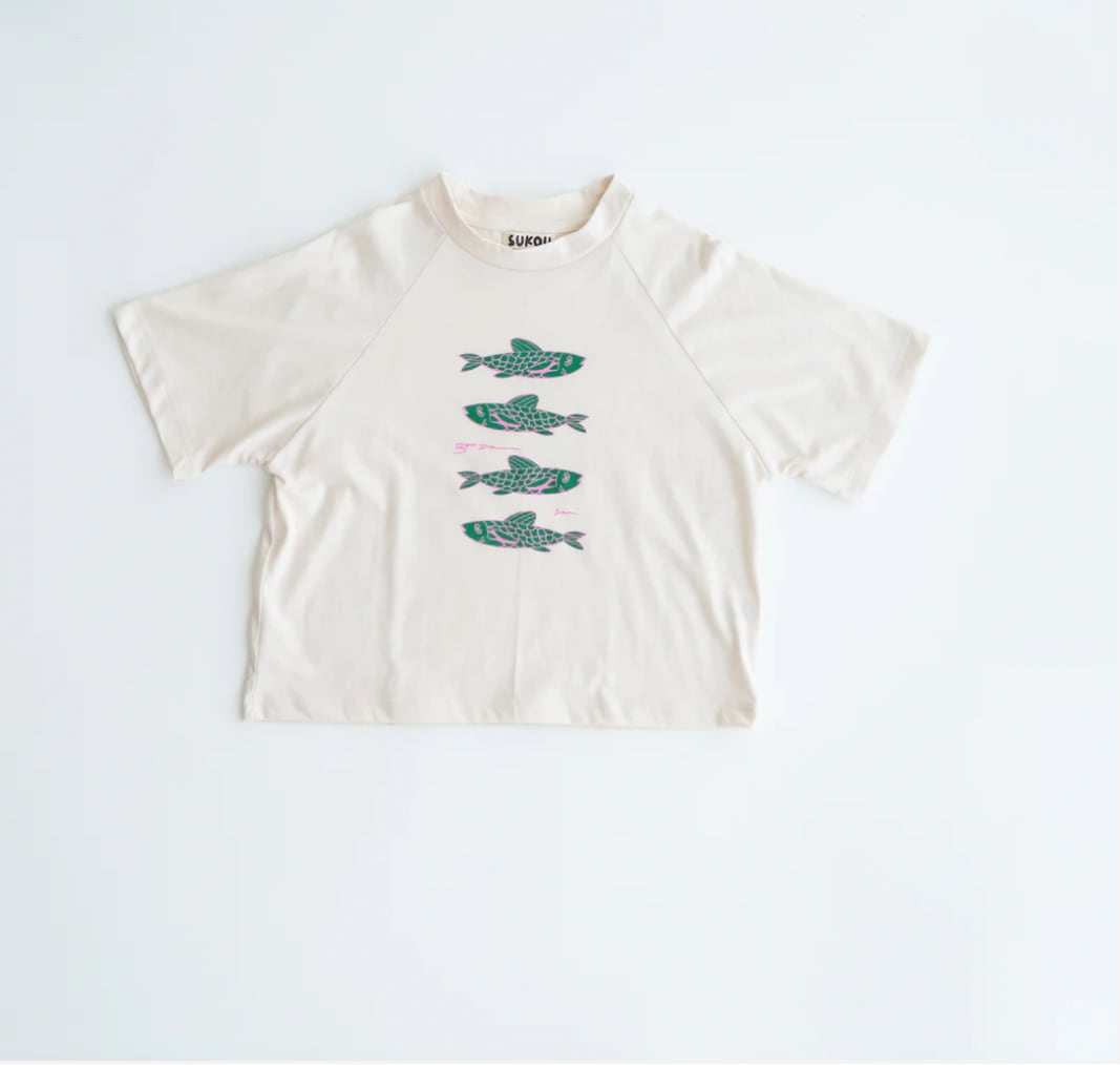 印象的なお魚プリントが、夏のコーディネートを引き立てます。