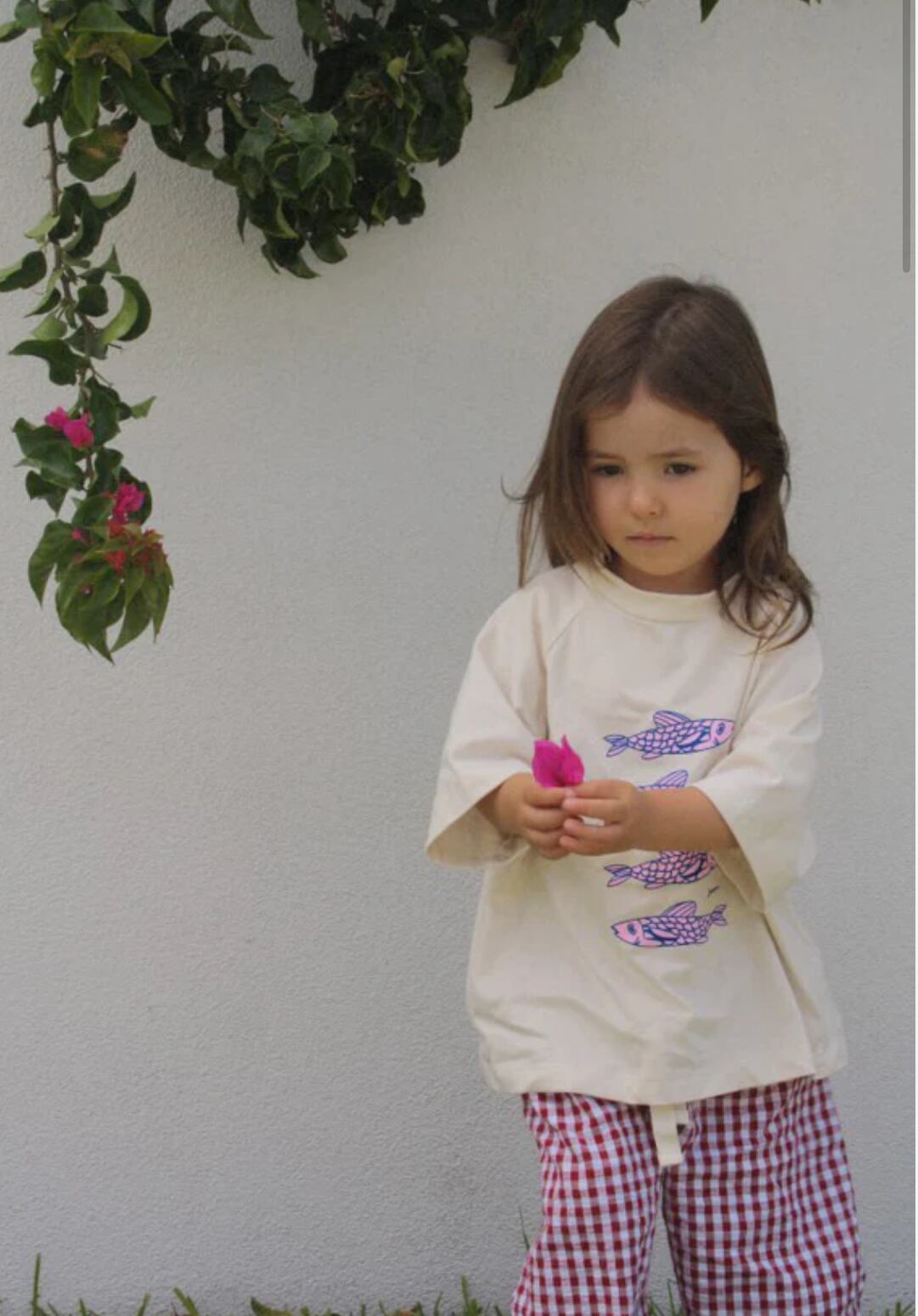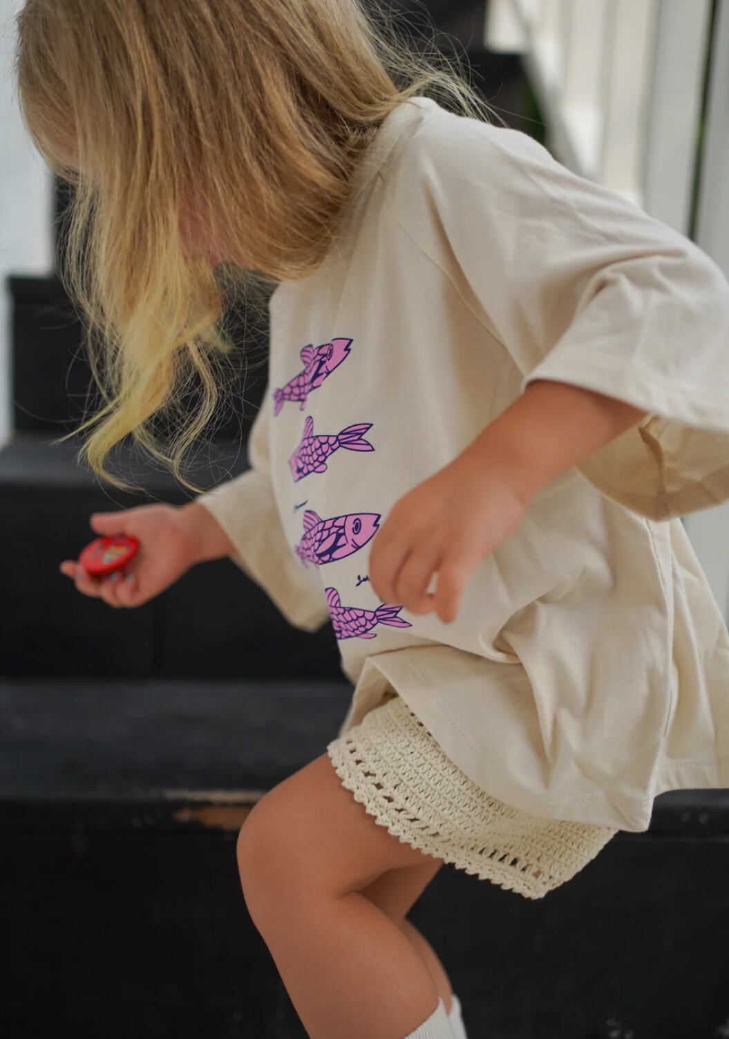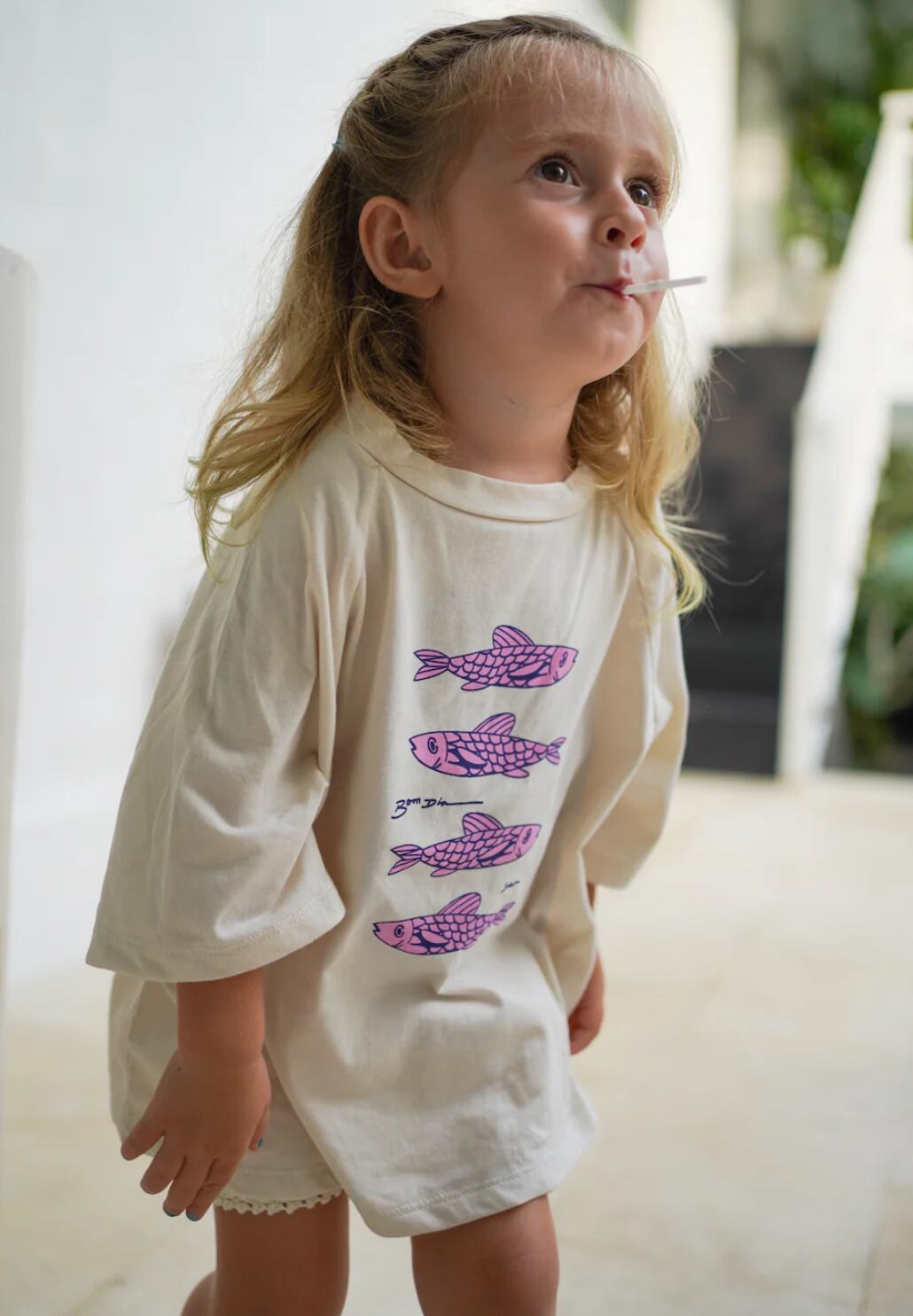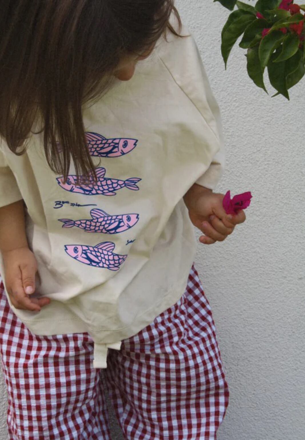 印象的なお魚プリントが、夏のコーディネートを引き立てます。