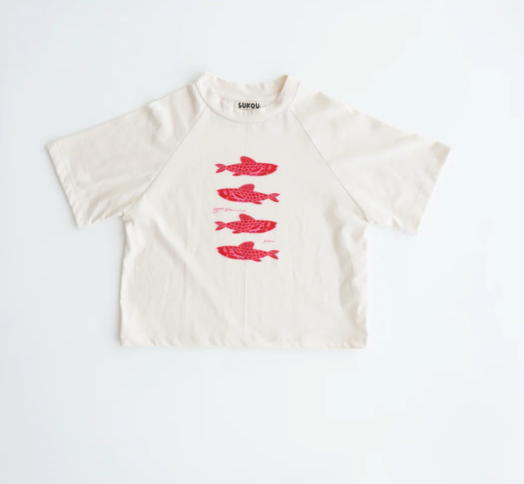 印象的なお魚プリントが、夏のコーディネートを引き立てます。