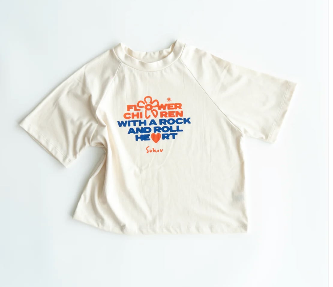 「FLOWER CHILDREN WITH A ROCK AND ROLL HEART」のポップなメッセージが、遊び心いっぱいの一枚です