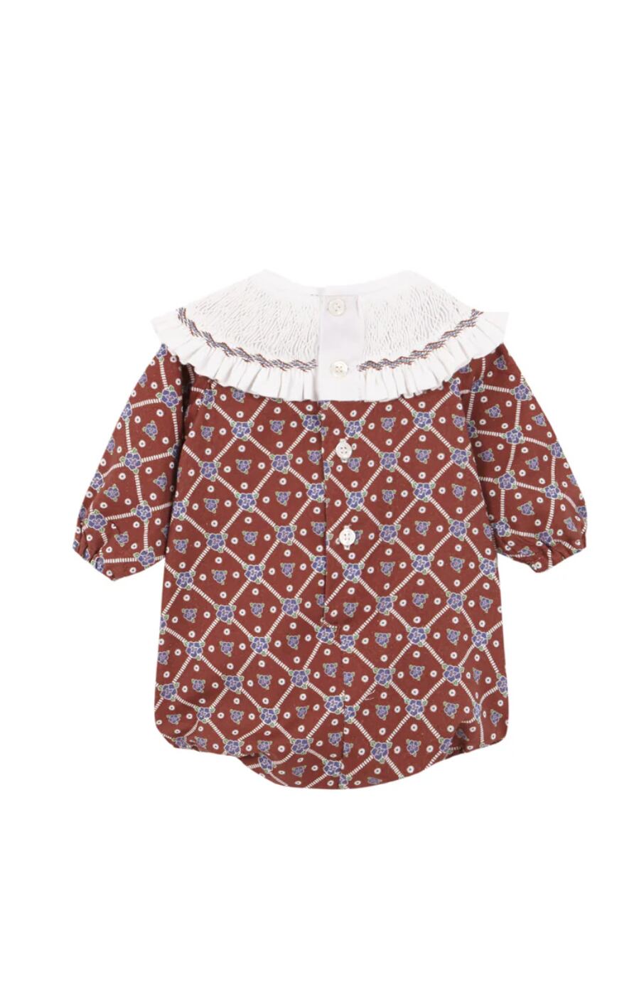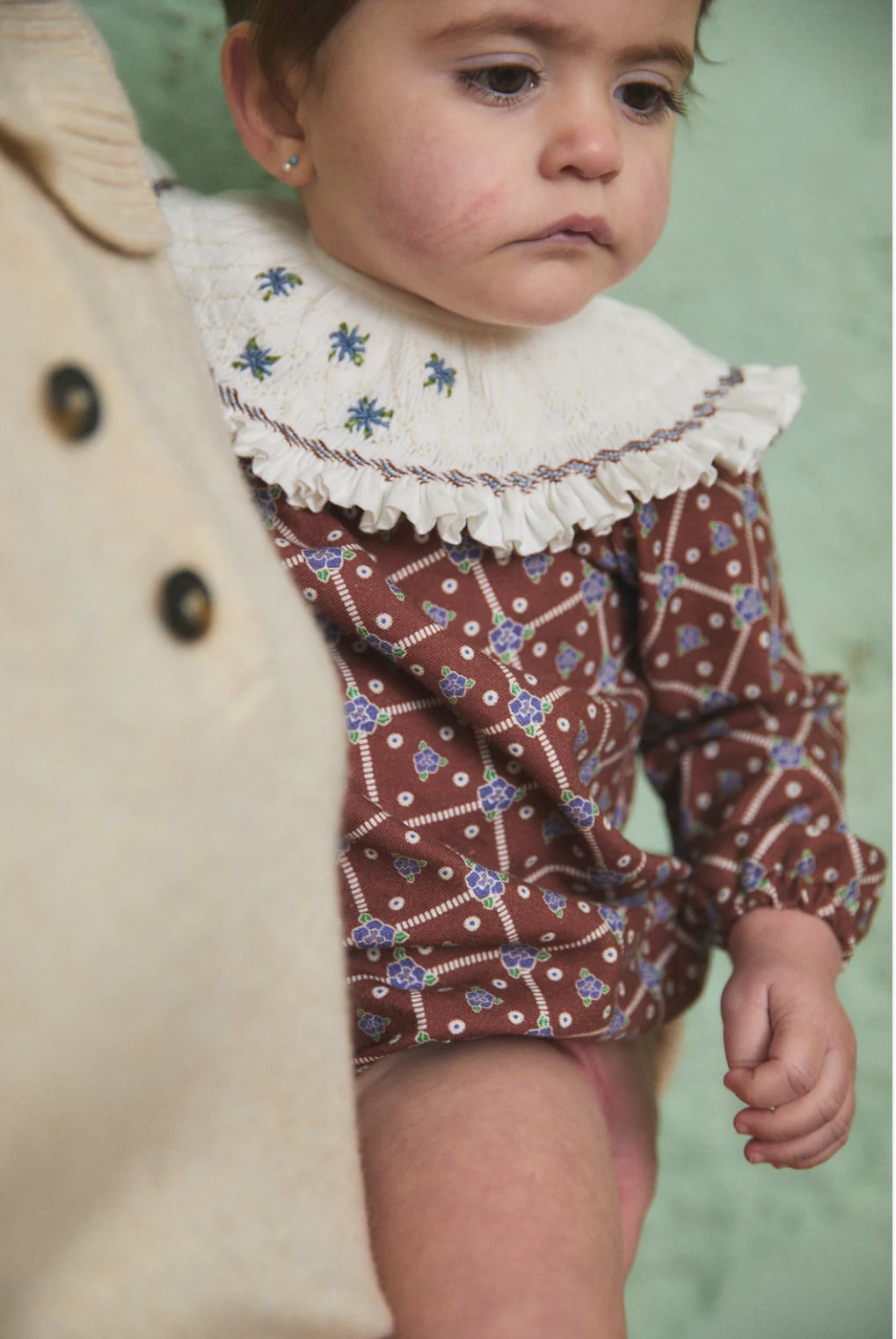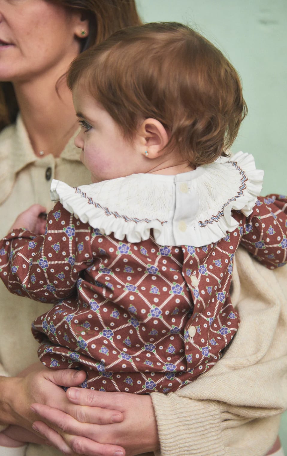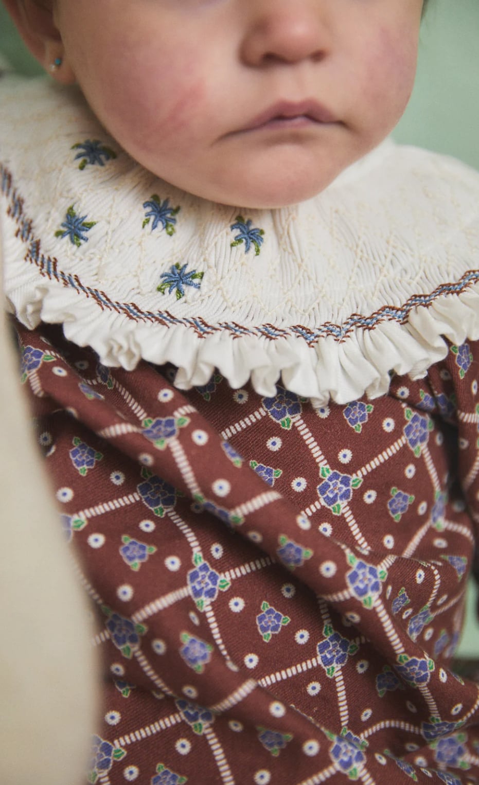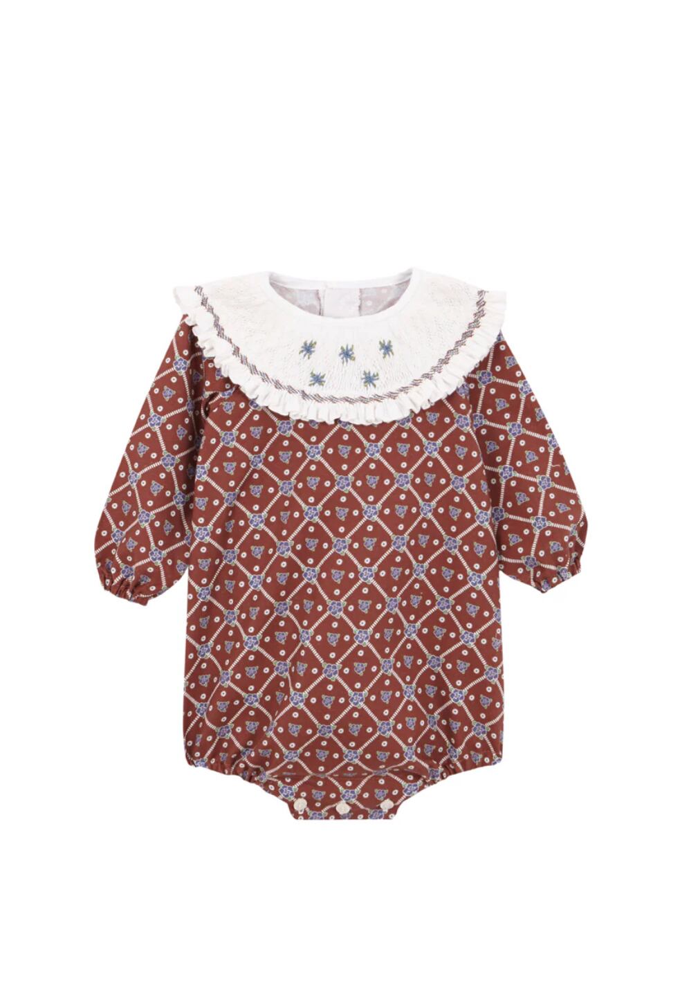 クラシカルな小花柄と、繊細な刺繍入りのレース襟が目を惹く特別なロンパース