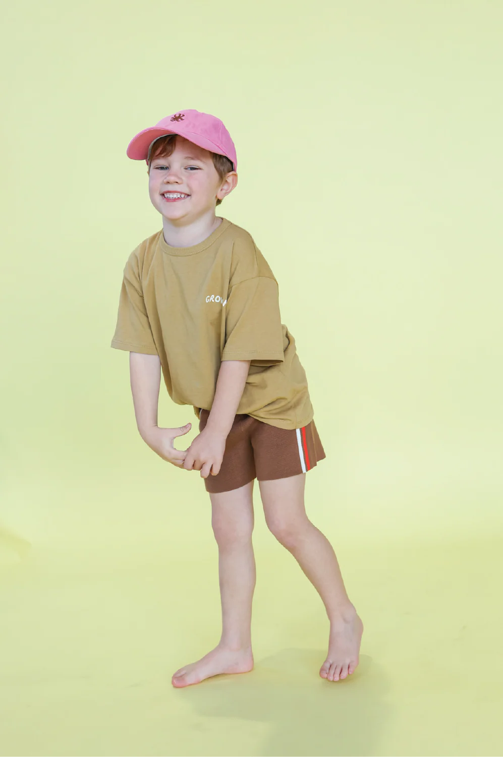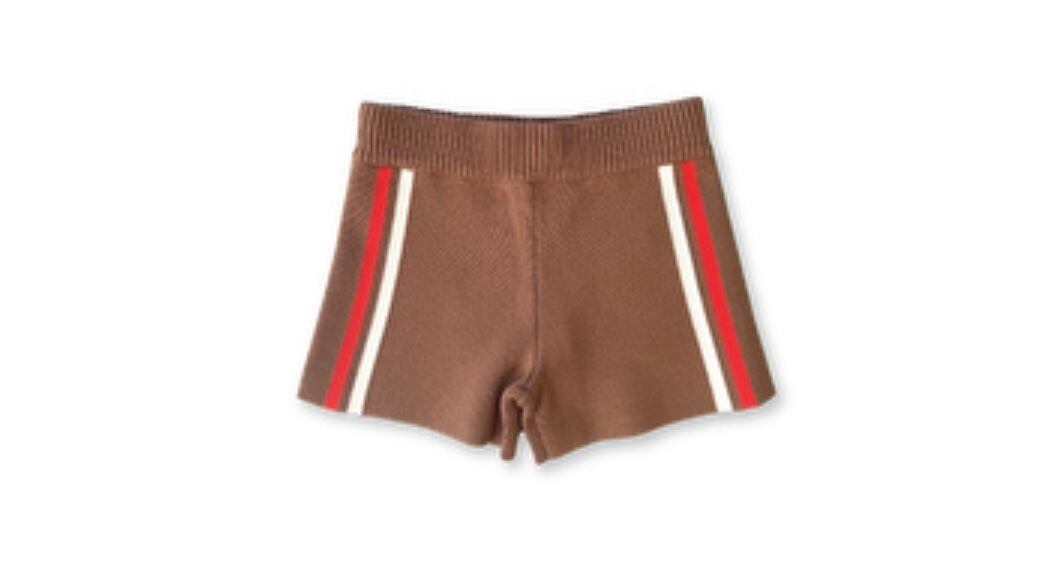 Milano Knit Shortsは、100%オーガニックコットンで作られた柔らかなニットショーツです。カラーは落ち着いたブラウニー。両サイドに入った赤と白のラインがアクセントになり、シンプルながらスタイリッシュなデザインに仕上がっています。伸縮性のあるリブウエストで動きやすく、お子さまのデイリーウェアにぴったり。快適さとおしゃれさを兼ね備えた一枚です。
