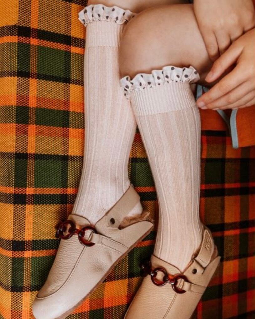 フリルとドット柄を組み合わせた、エレガントで遊び心のあるハイソックス。