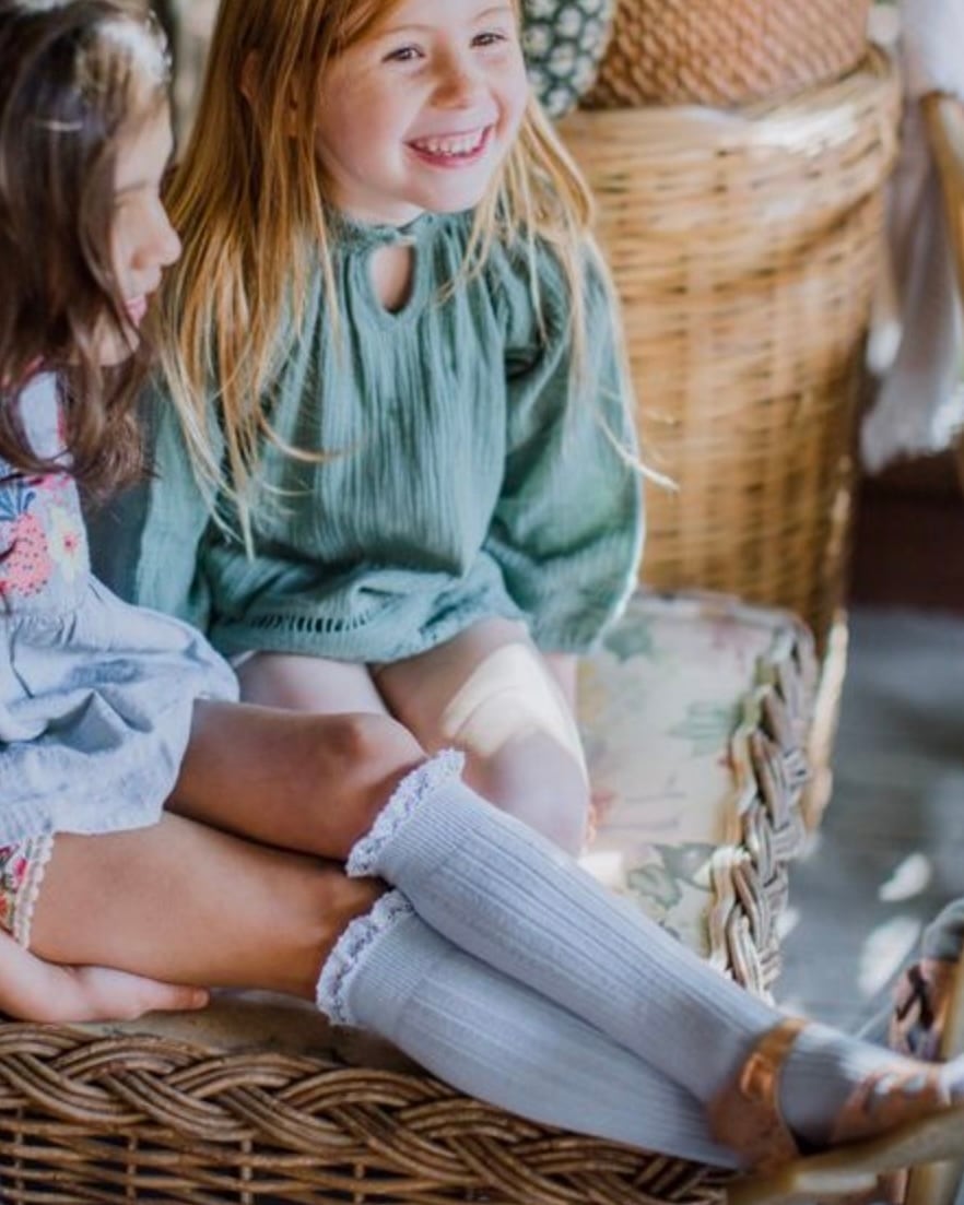 カレー産レース(Dentelle de Calais®)をトーン・オン・トーンであしらった、エレガントなリブ編みハイソックス。