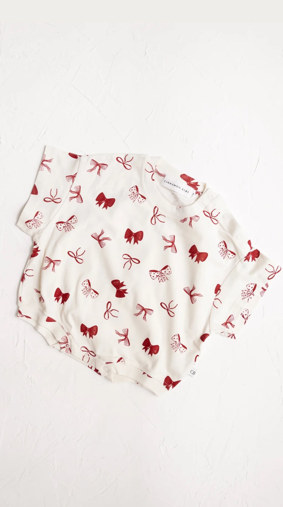 **「Bow Tシャツロンパース」**は、心地よさとフェスティブな華やかさを兼ね備えた一枚。