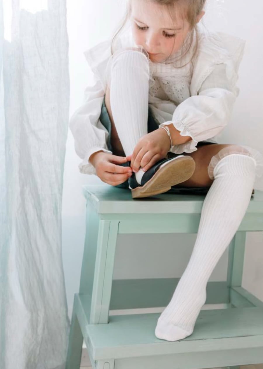 季節を問わず活躍し、動きやすさと暖かさを両立。お子さまの足元をエレガントに彩ります。