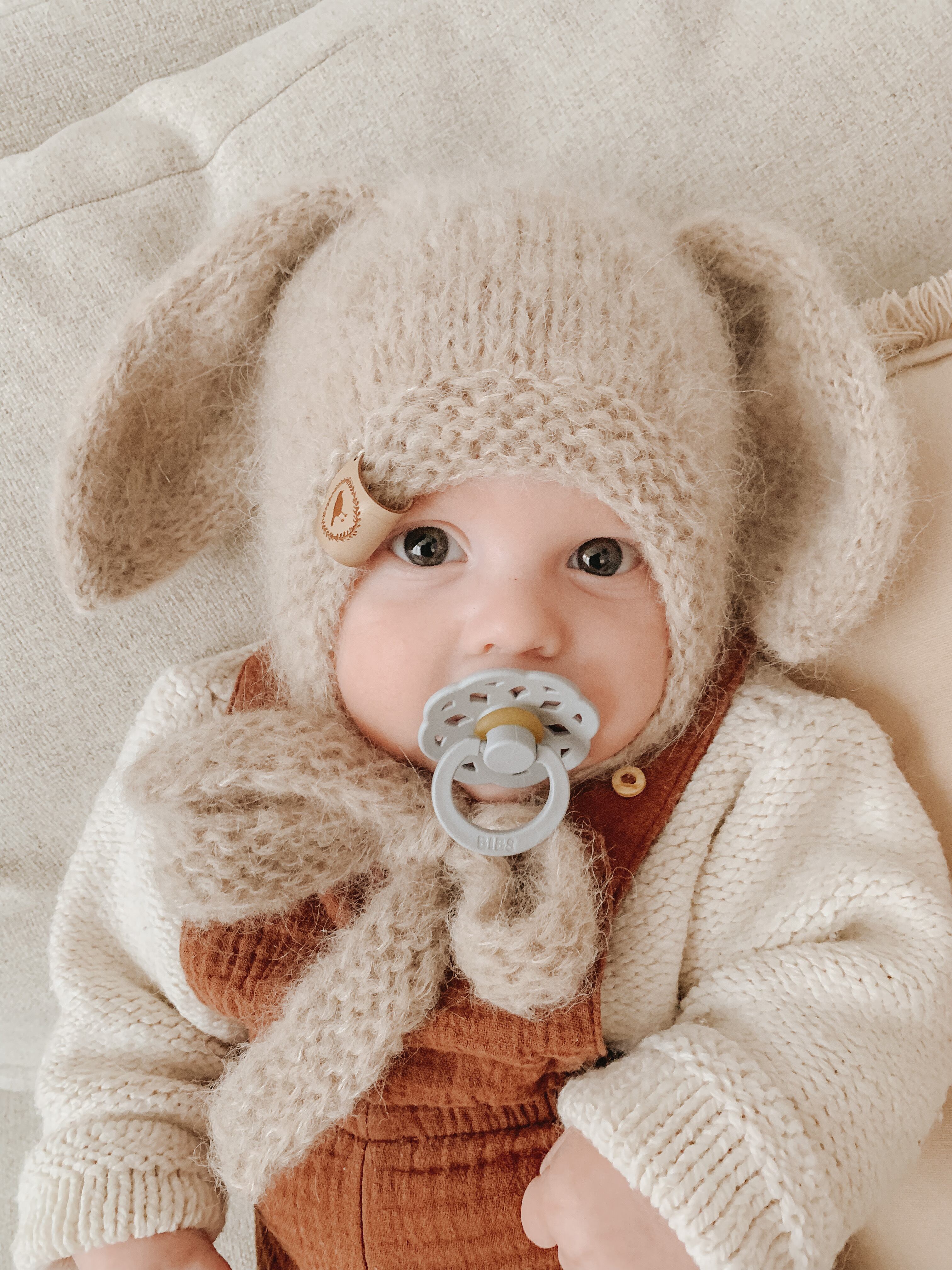 柔らかく繊細なアルパカウールに、上質なシルクを少し加えて手編みで仕上げた、愛らしいラビットデザインの帽子です。