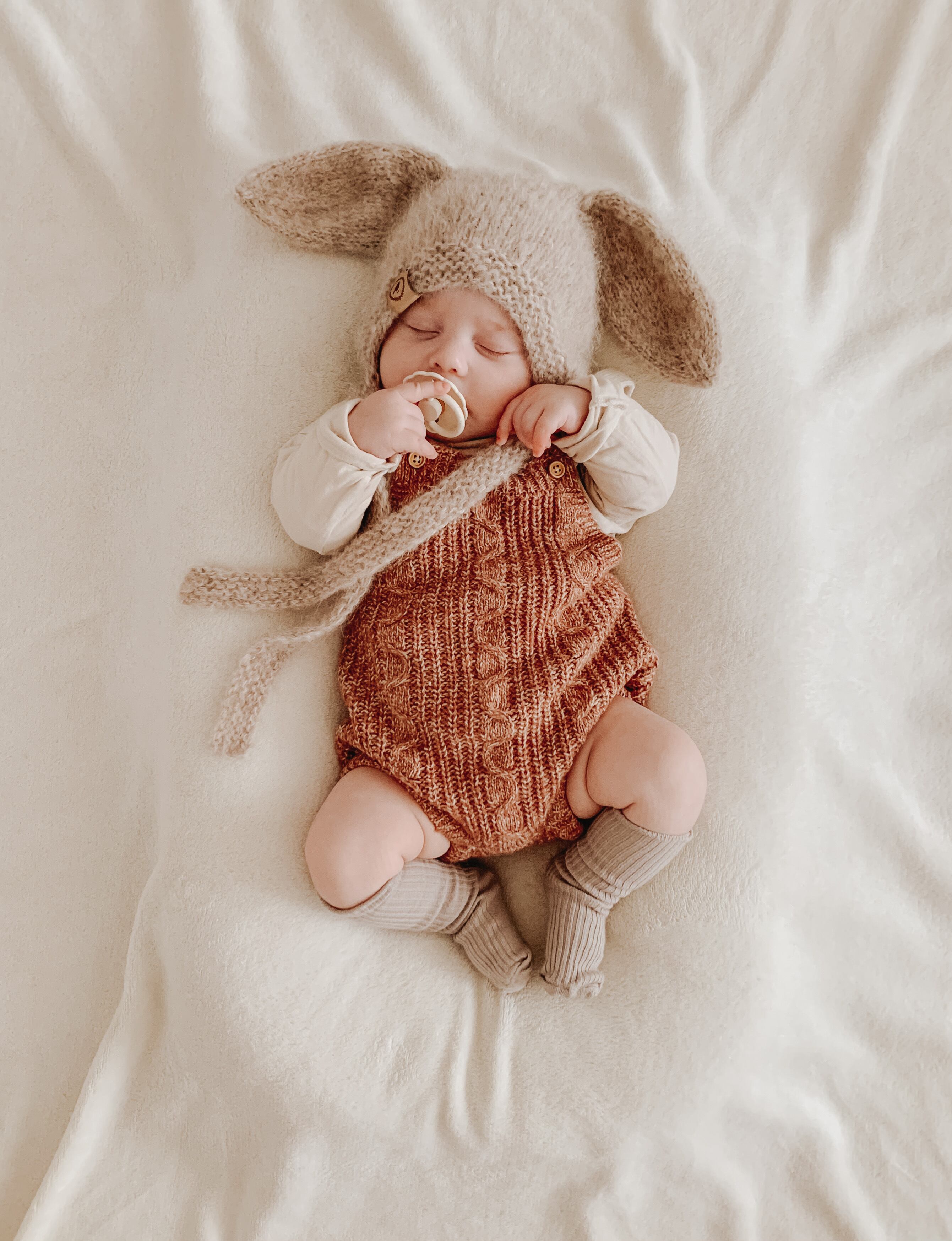 ふんわりとした糸の質感と、うさぎをモチーフにしたユニークなデザインが、どんなお子さまも可愛らしく見せてくれます。