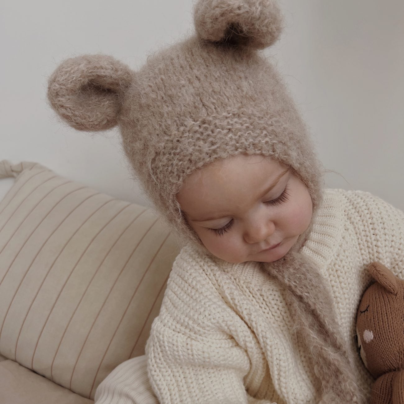 ふんわりとした糸の質感と、ねずみをモチーフにしたユニークなフォルムが、お子さまをより可愛らしく演出します。