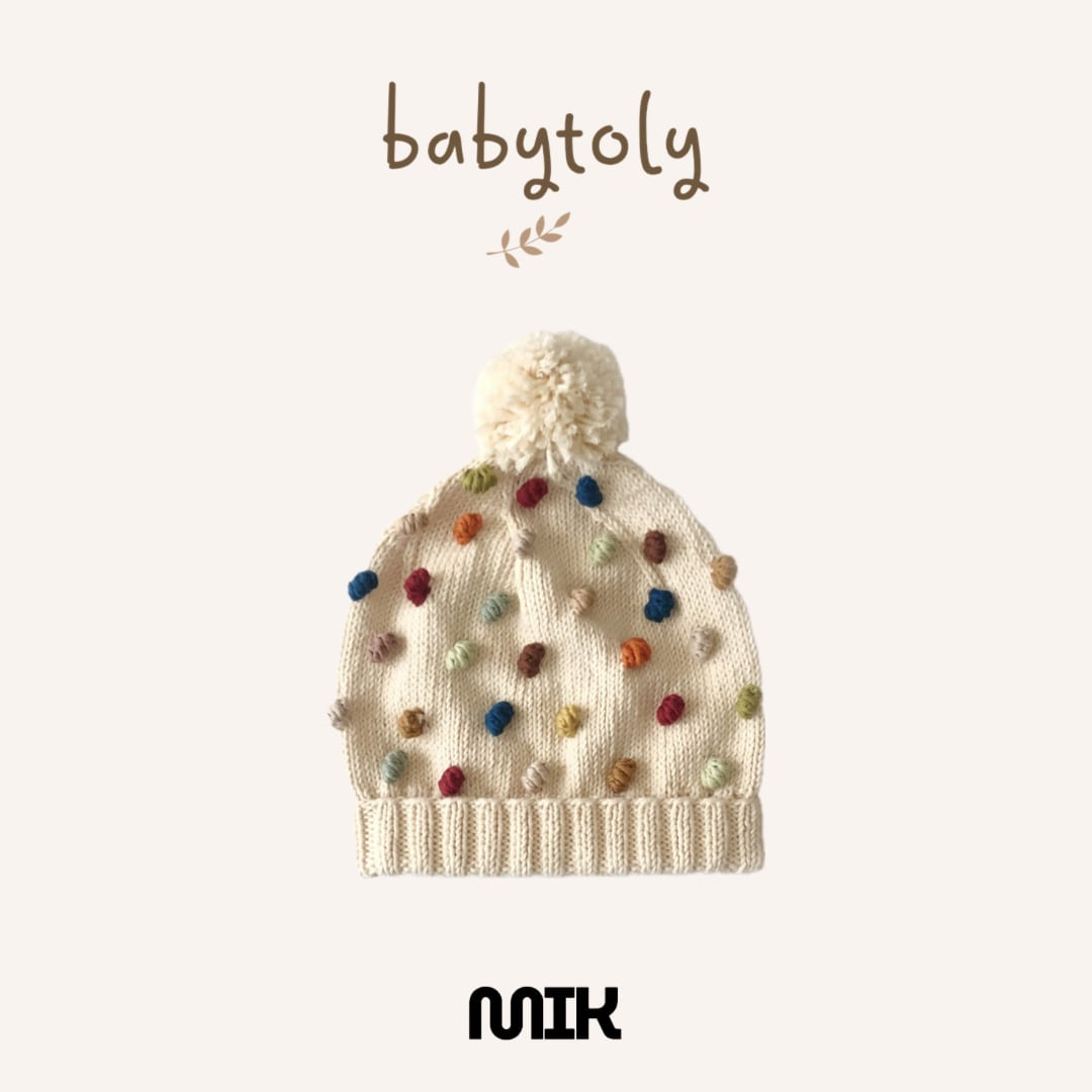 カラフルな“ポップコーン”編みが散りばめられた、Babytolyらしい温もりあふれるニットビーニー。