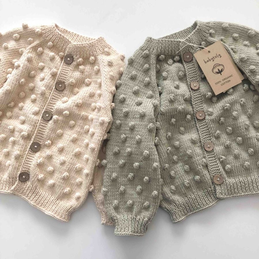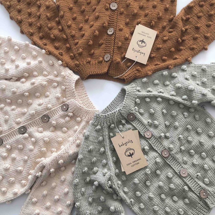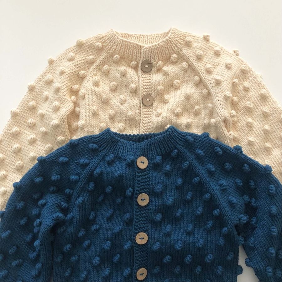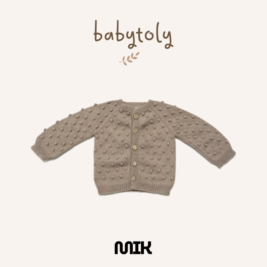 立体的なポップコーン編みが全体に散りばめられた、Babytolyのニットカーディガン。