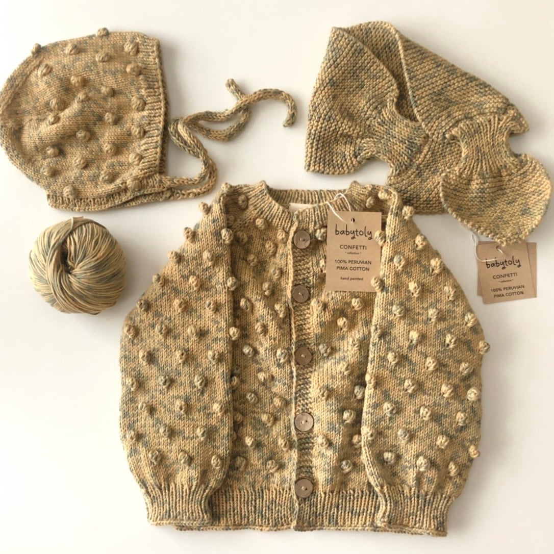 立体的なポップコーン編みが全体に散りばめられた、Babytolyのニットカーディガン。