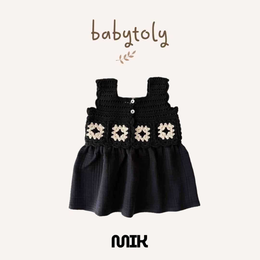 クロシェ編みとガーゼ素材を組み合わせた、Babytolyのシグネチャードレス。