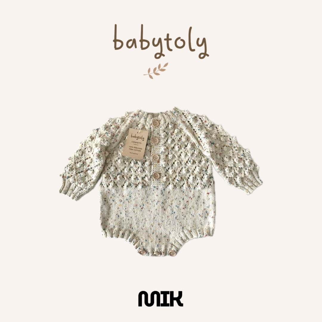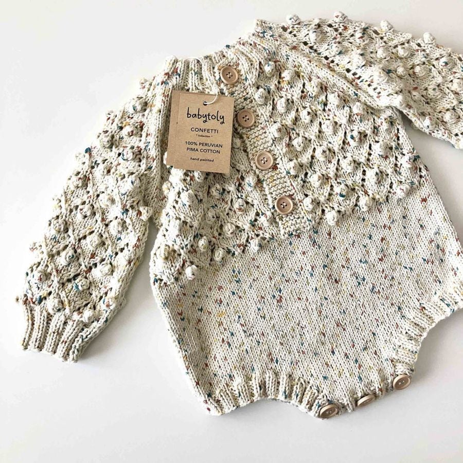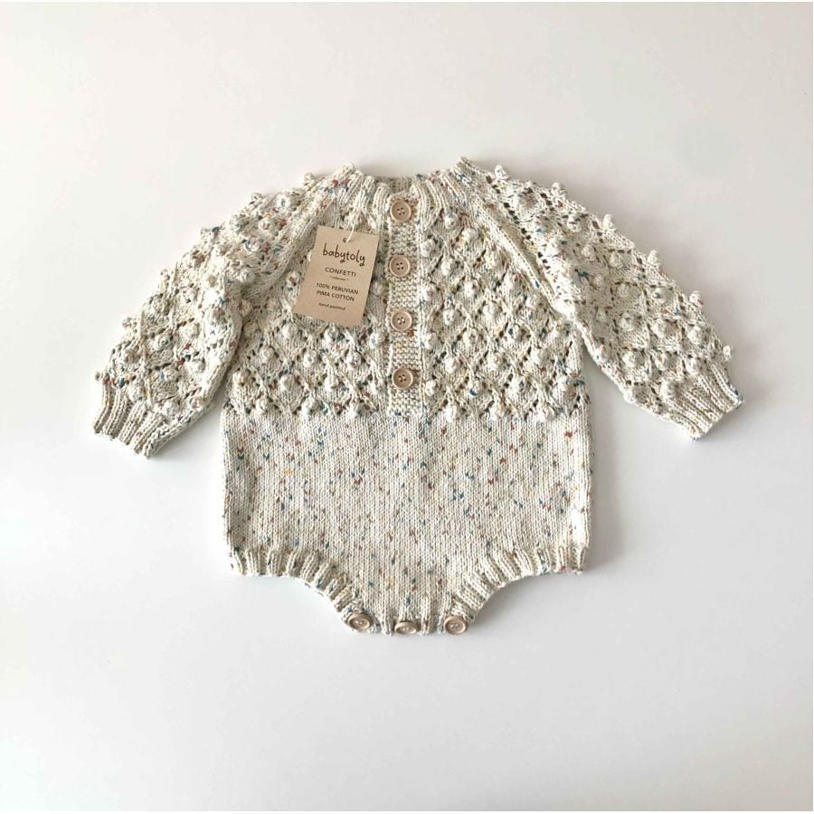 GOTS認証を取得した100%オーガニックコットンを使用し、ひとつひとつ丁寧に手編みされたベビーロンパースです。