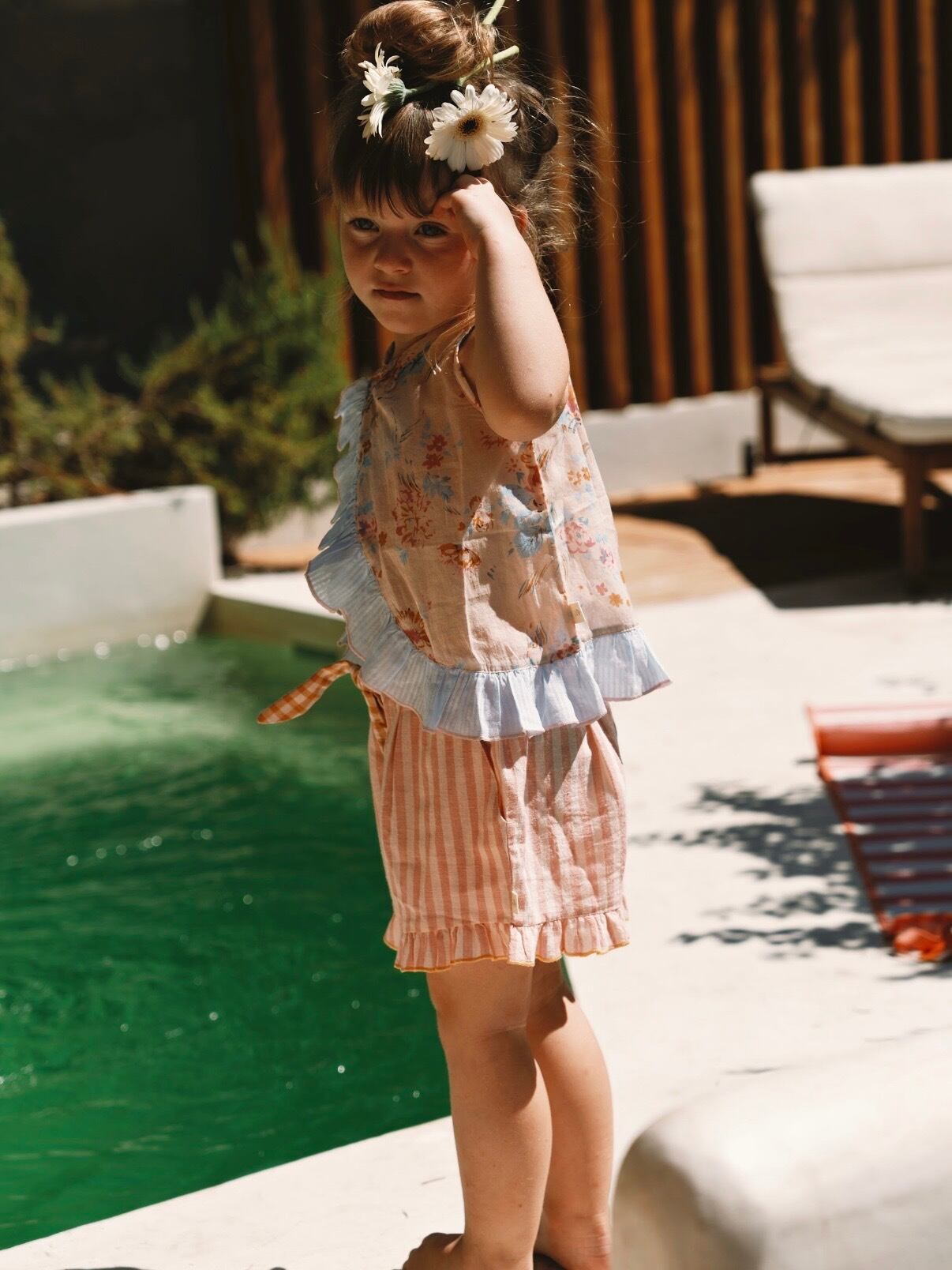 裾の繊細なフリルが軽やかでフェミニンな印象を添え、日差しの下でのコーディネートにもぴったり。