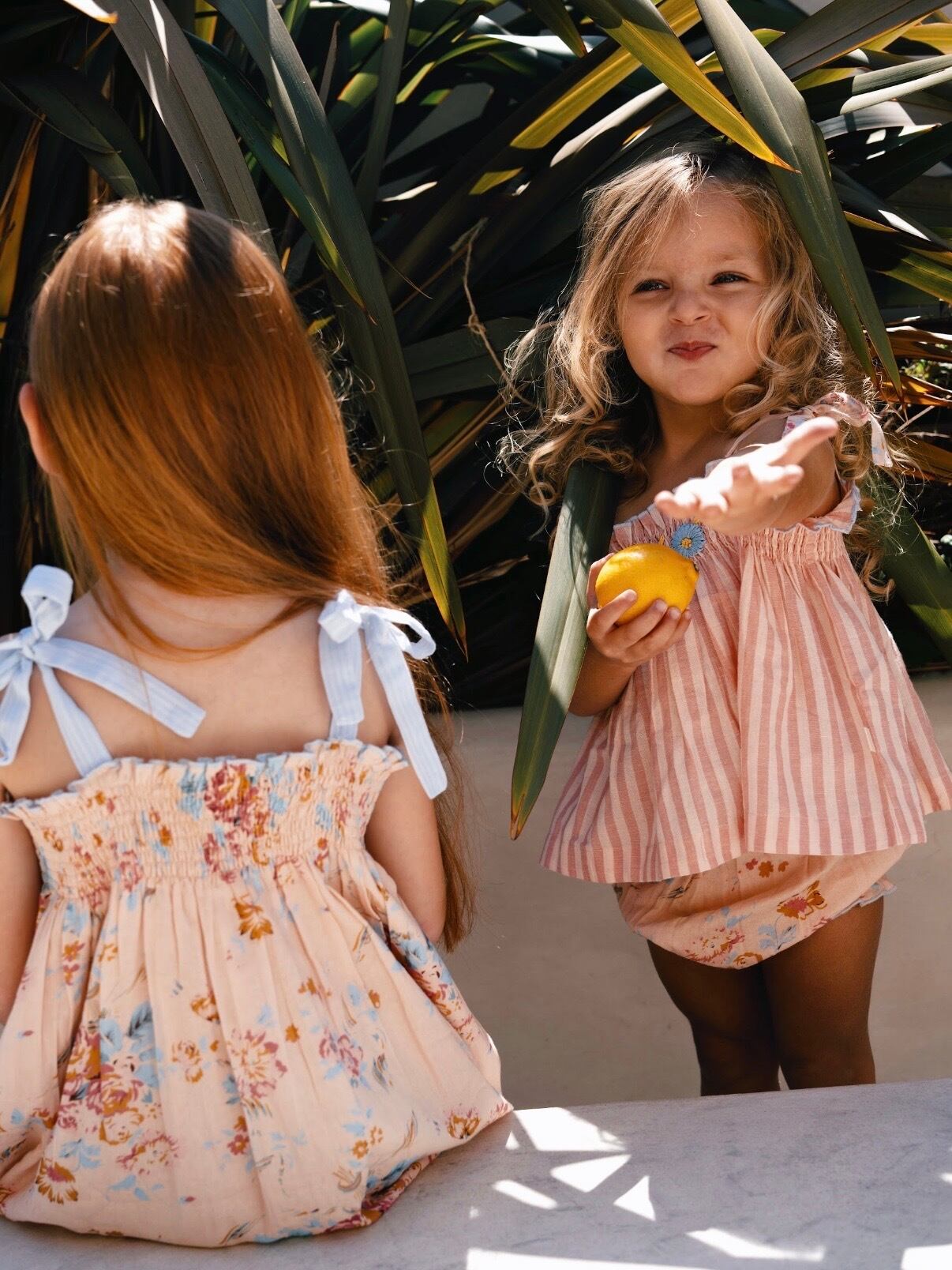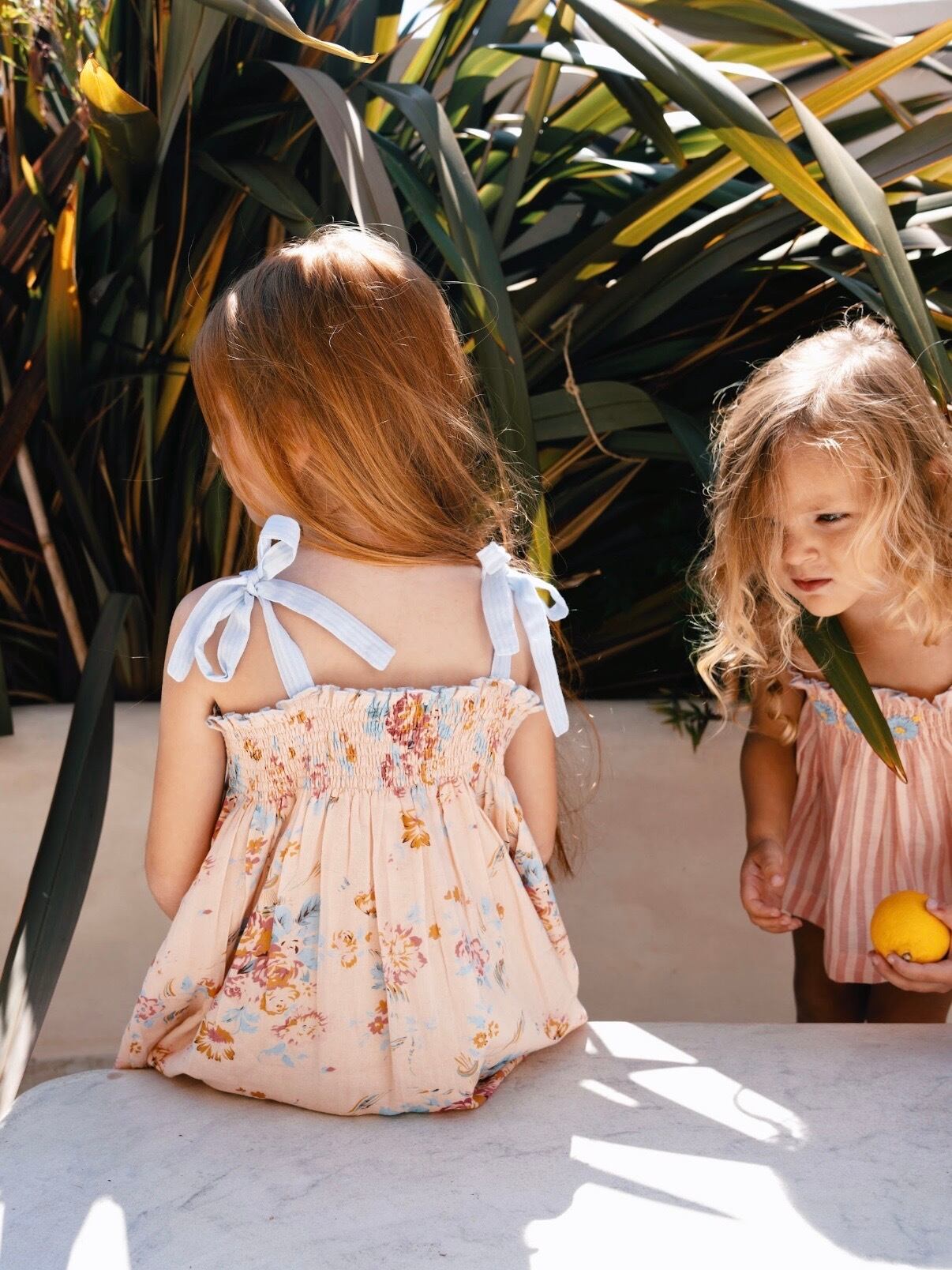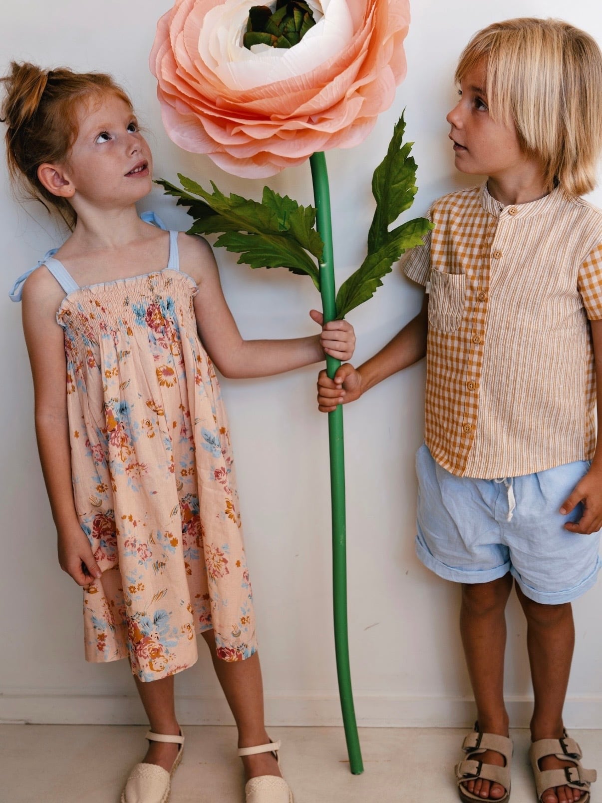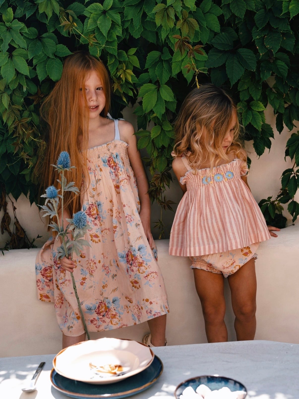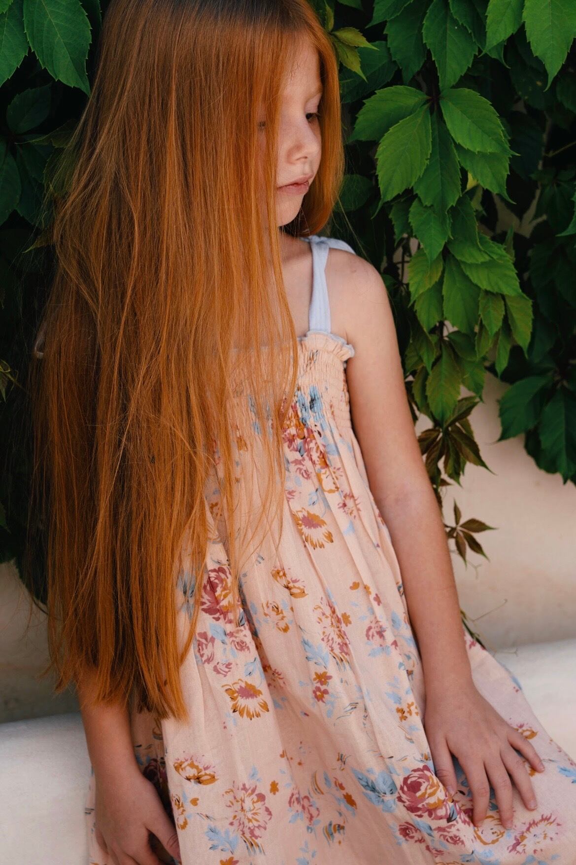 柔らかく上質な素材で仕立てたフラワープリントのガールズドレス。