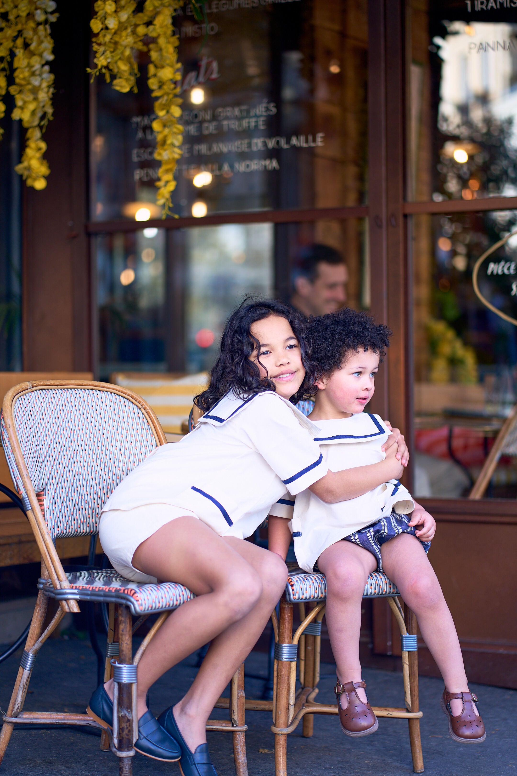 セーラーカラーと襟元のコントラストディテールが、上品で洗練された印象を演出します。