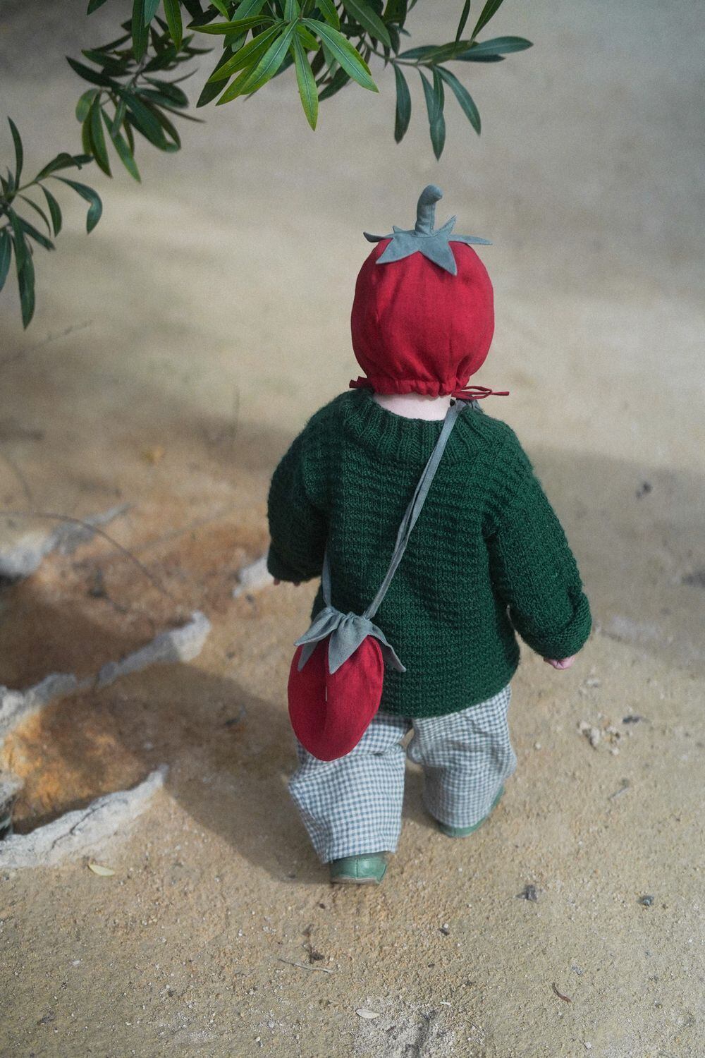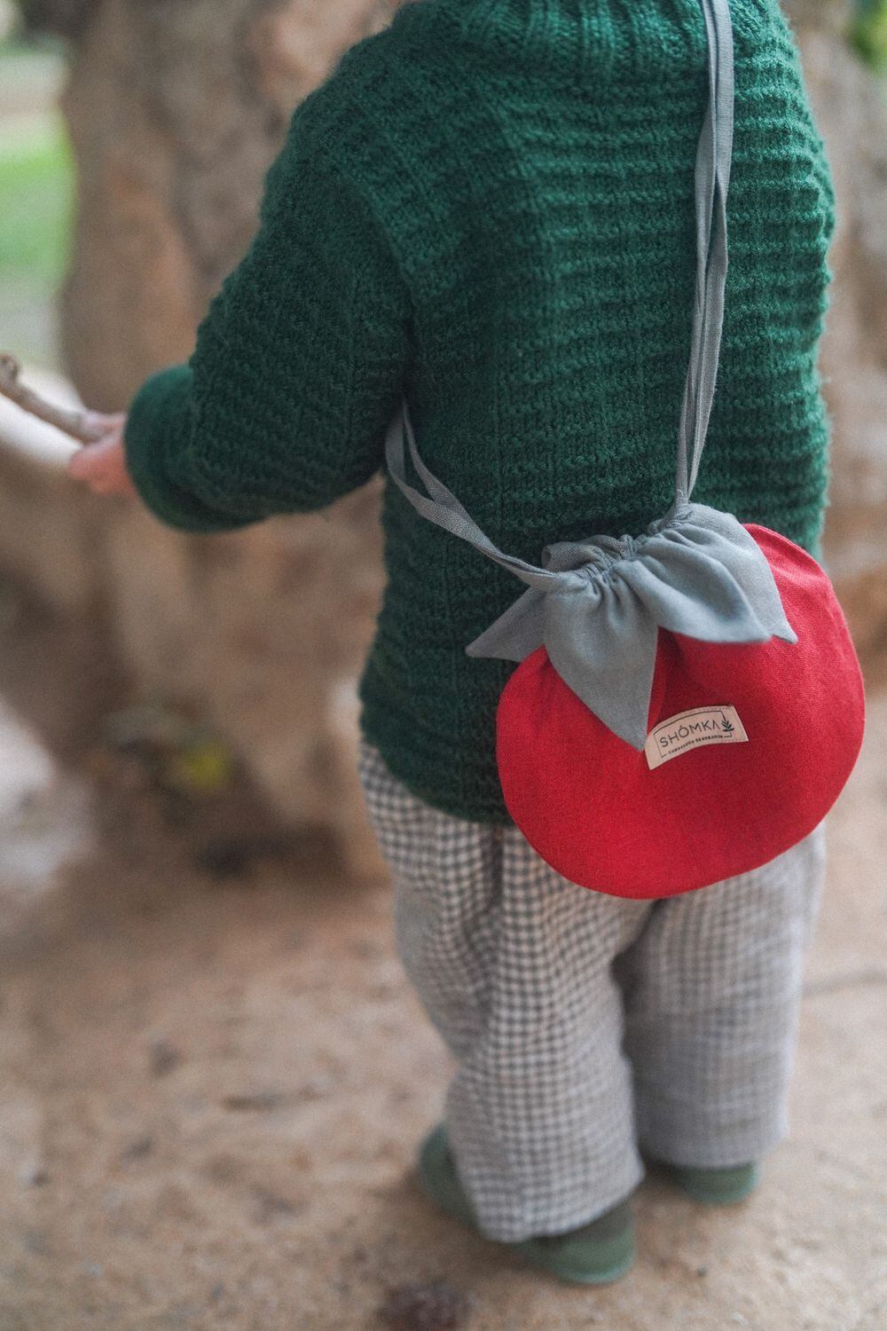 天然リネンを使用した、トマトモチーフのクロスボディポーチ。
