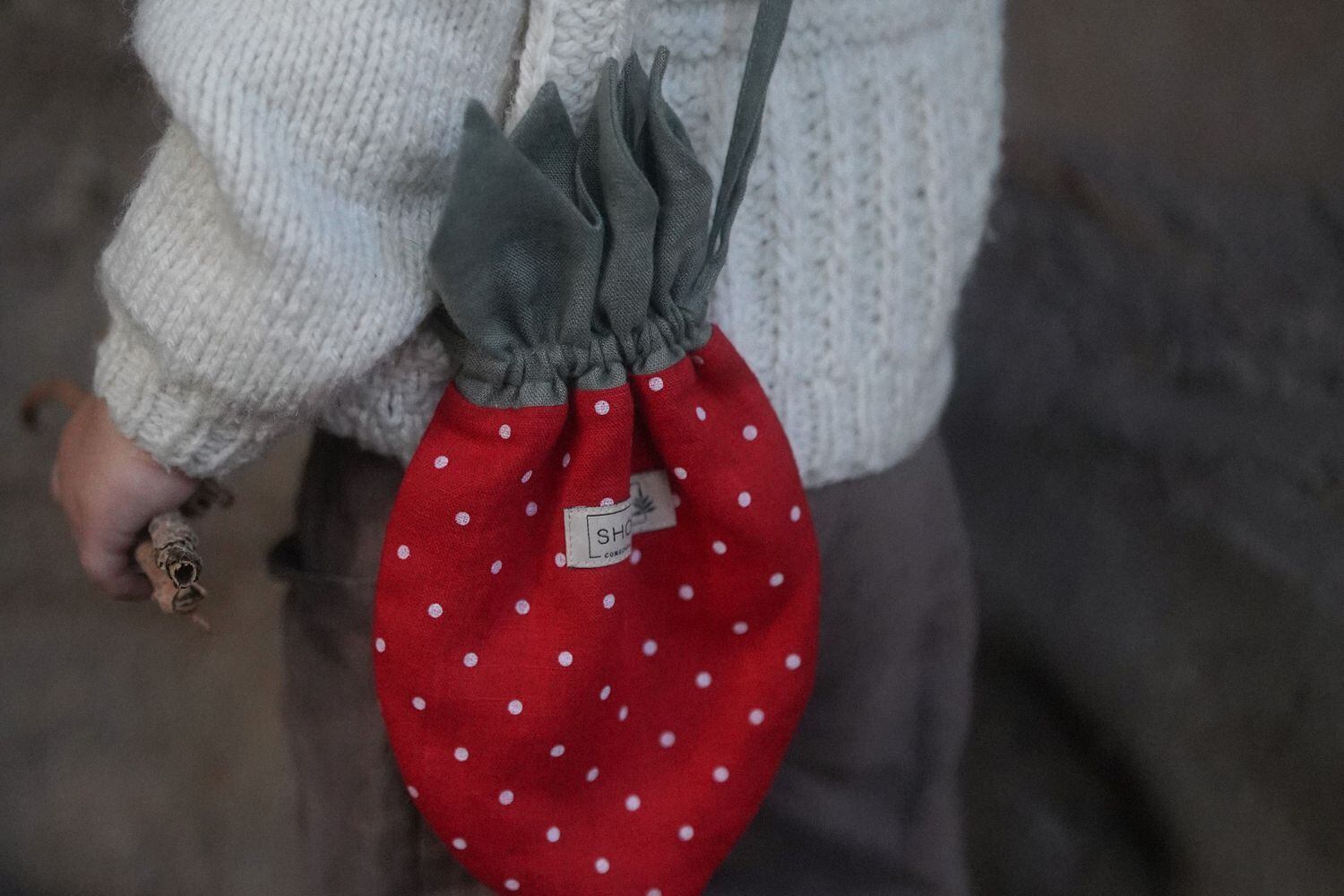 天然リネンを使用した、いちごモチーフのクロスボディポーチ。